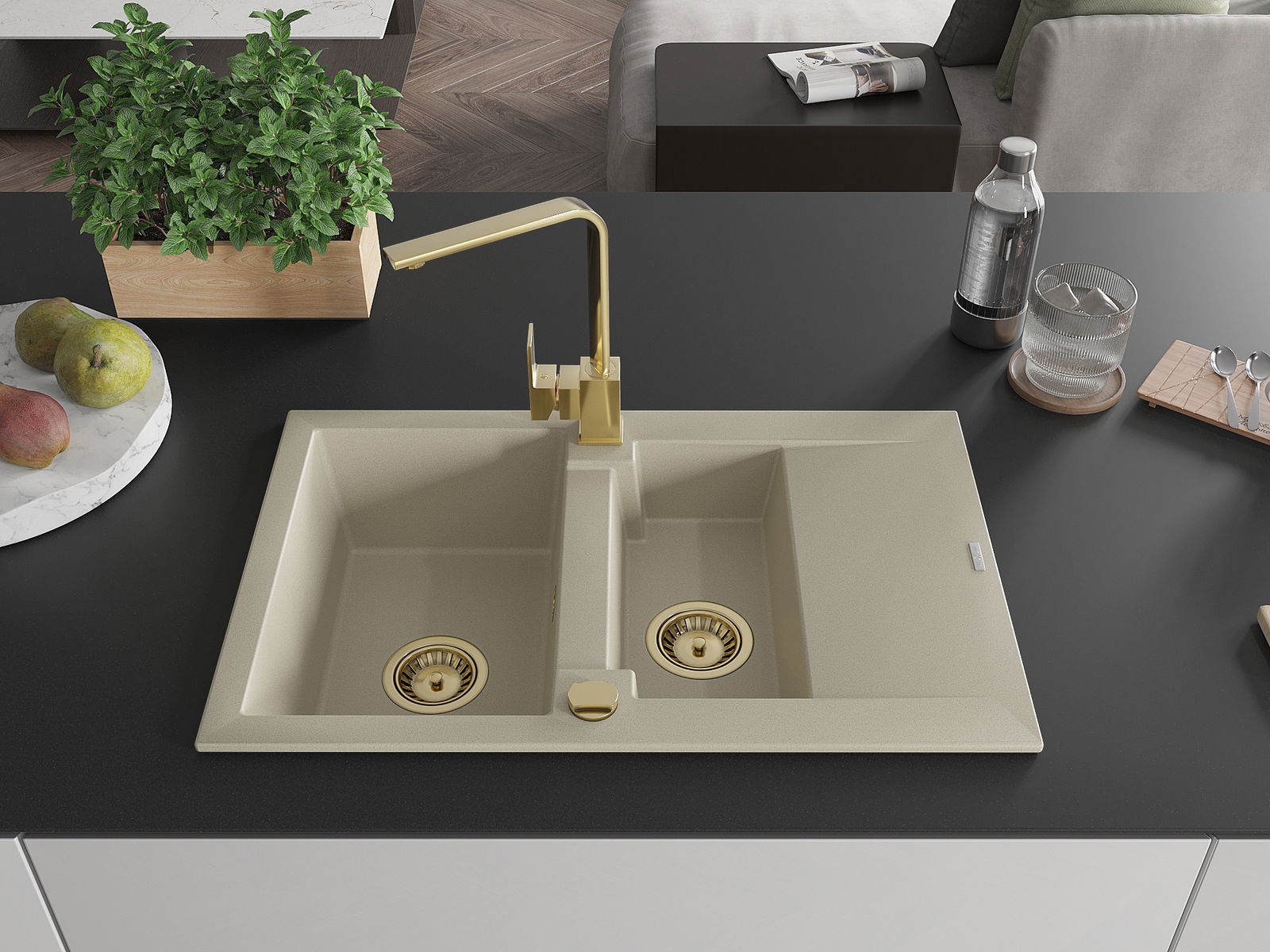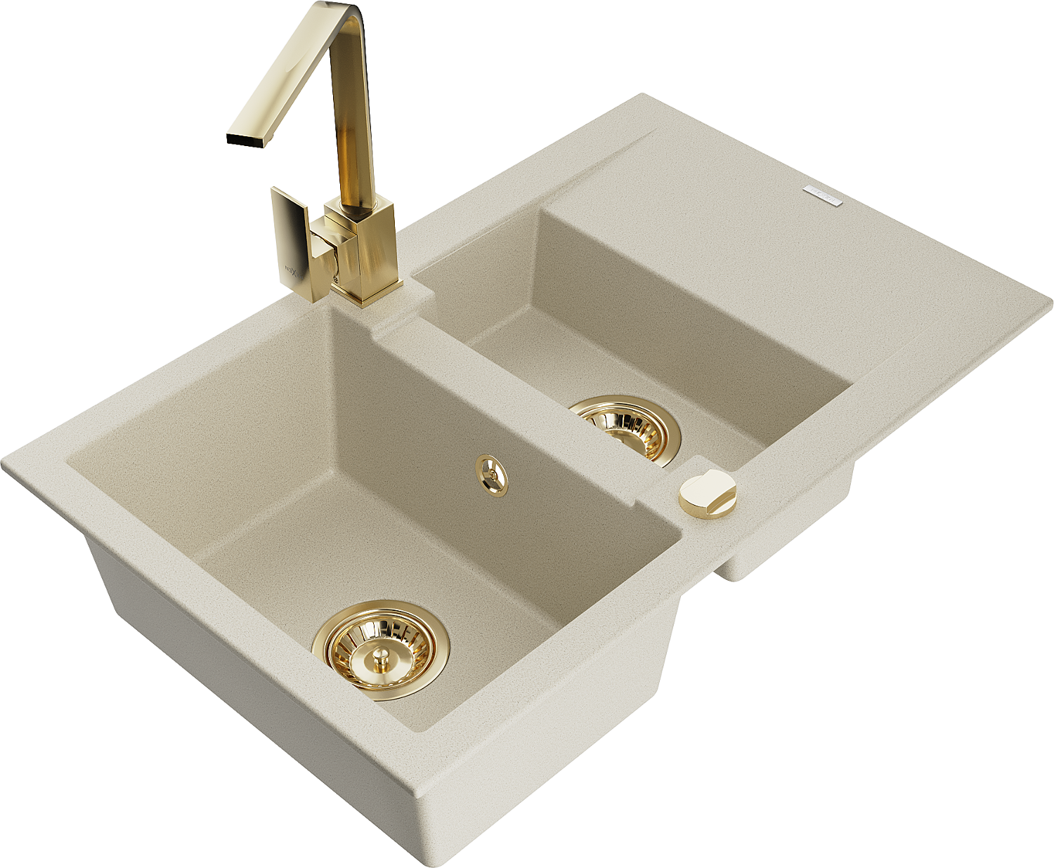 Mexen Gaspar žulový dřez 1,5-komorový s odkapávačem a kuchyňskou baterií Rita, béžový - 6507-69-670300-50