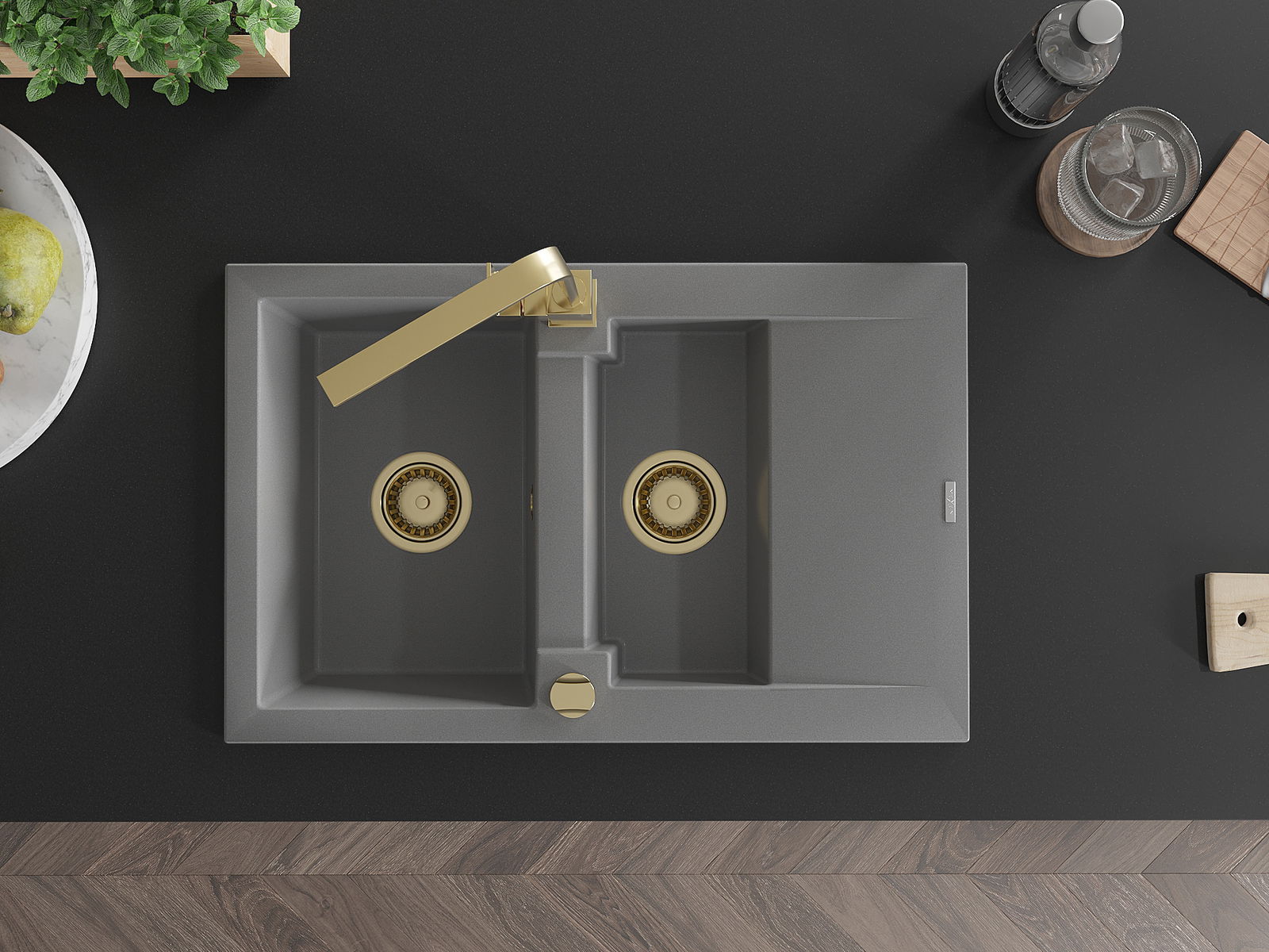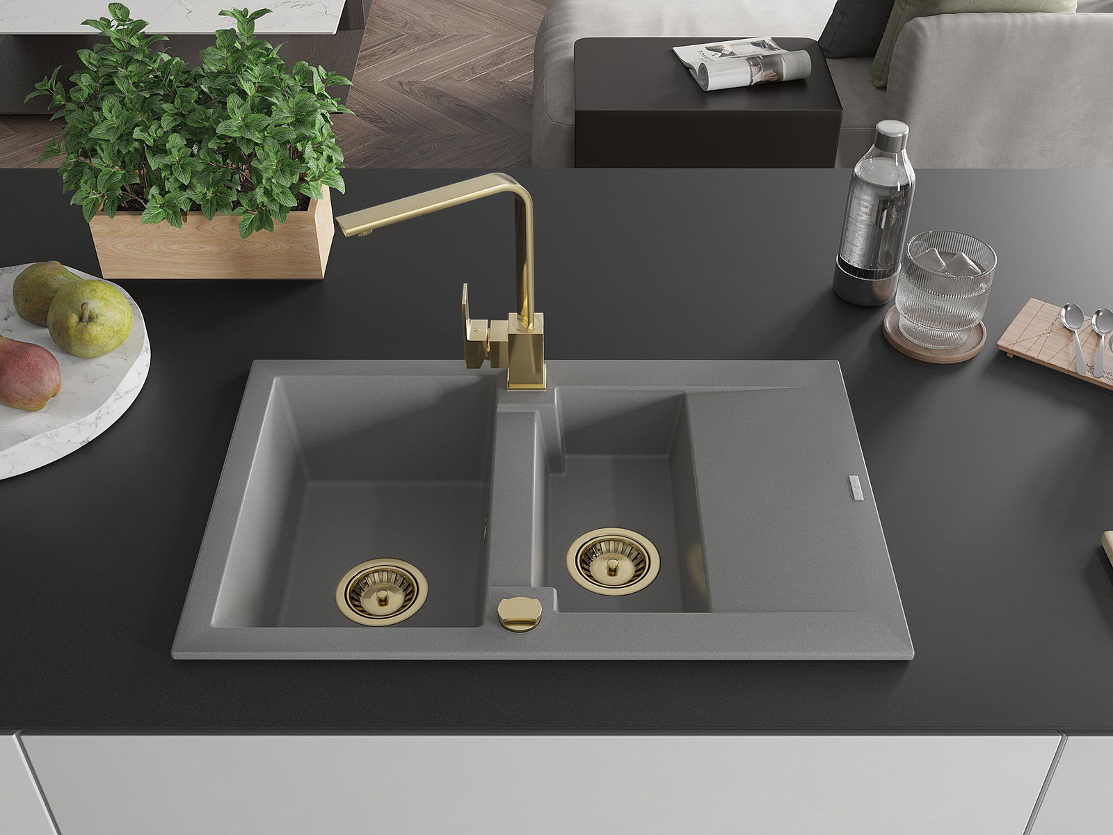 Mexen Gaspar granitový dřez 1,5-komorový s odkapávačem a kuchyňskou baterií Rita, šedý - 6507-71-670300-50