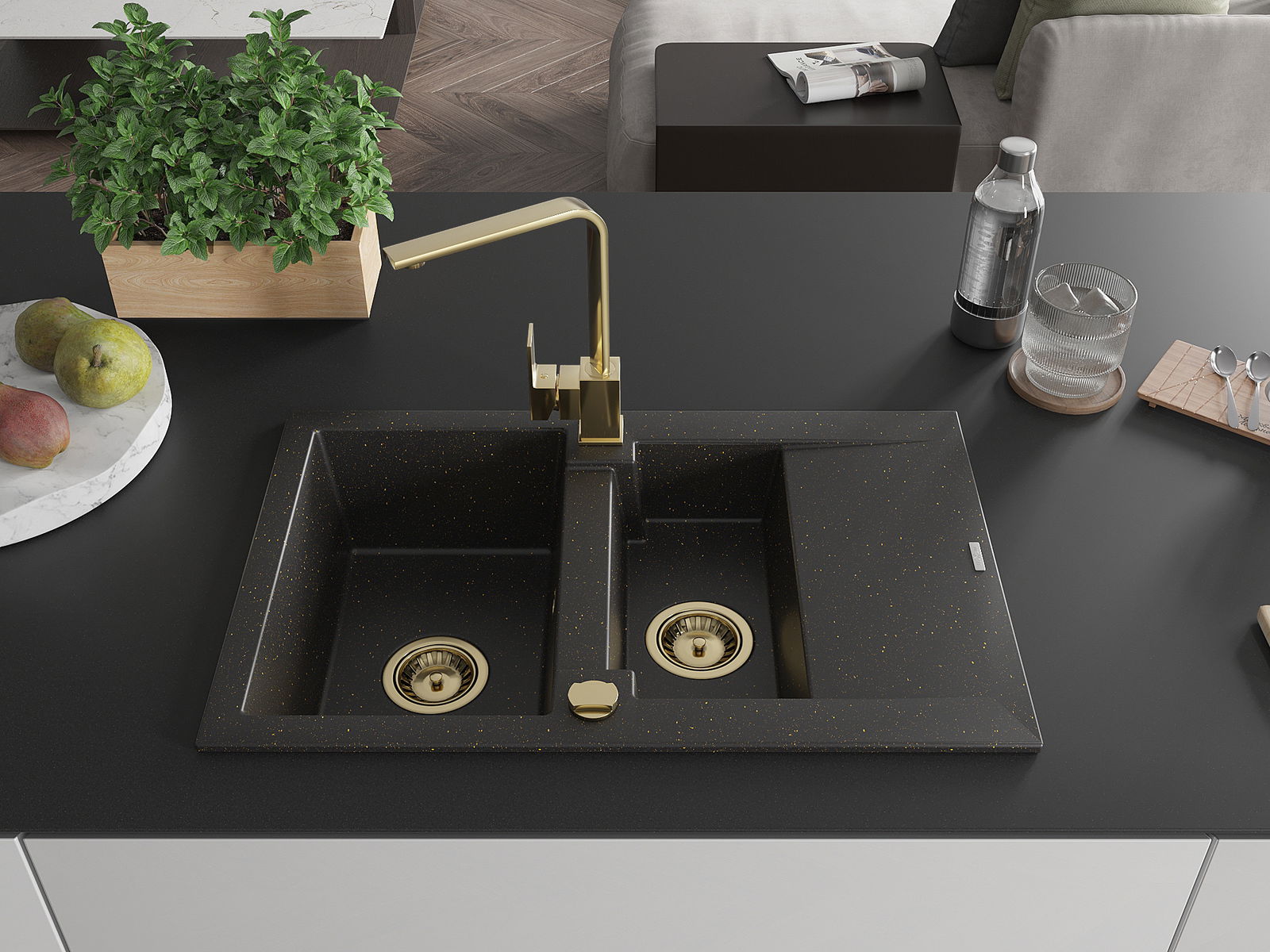 Mexen Gaspar granitový dřez 1,5-komorový s odkapávačem a kuchyňskou baterií Rita, černý/zlatý - 6507-75-670300-50
