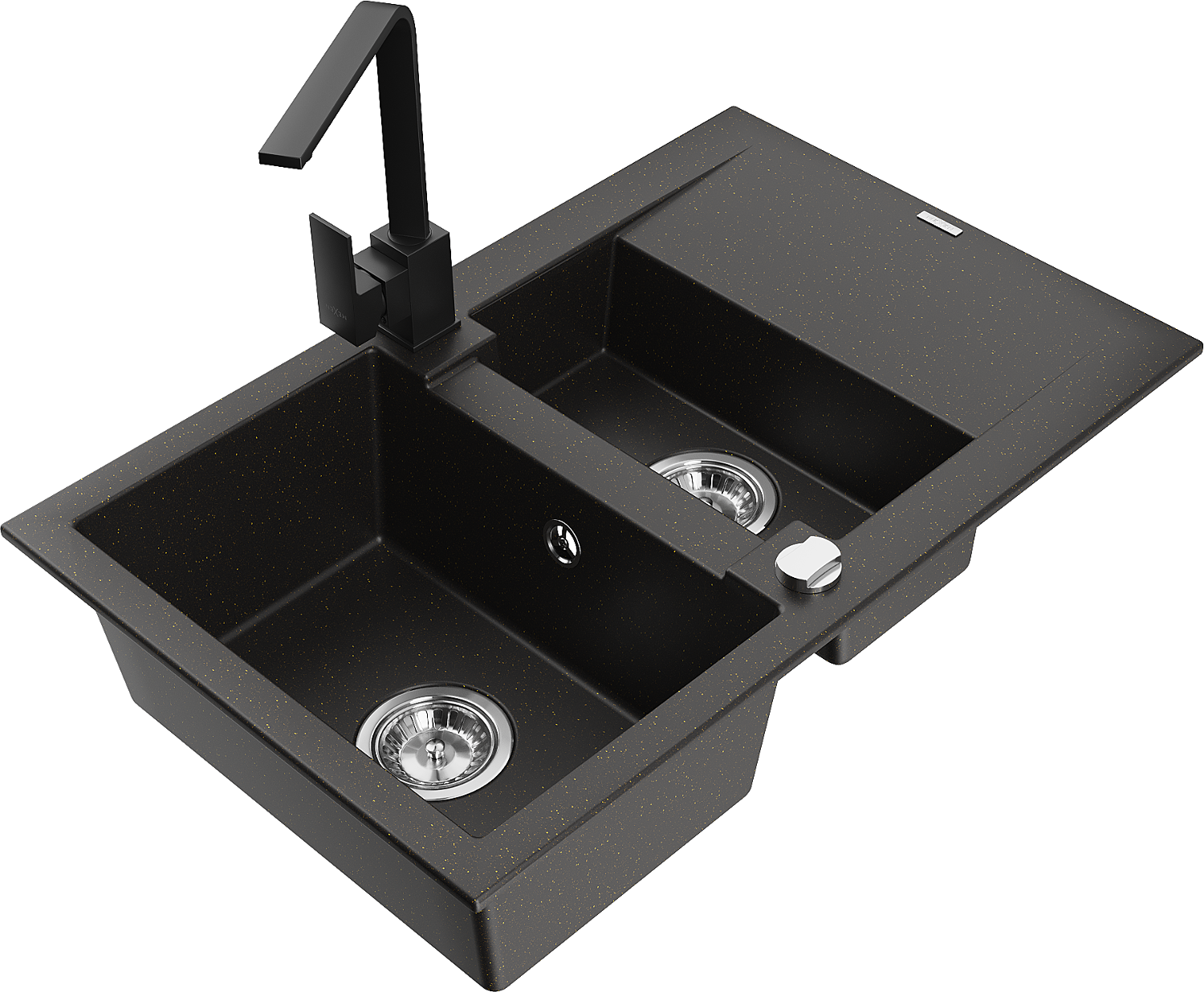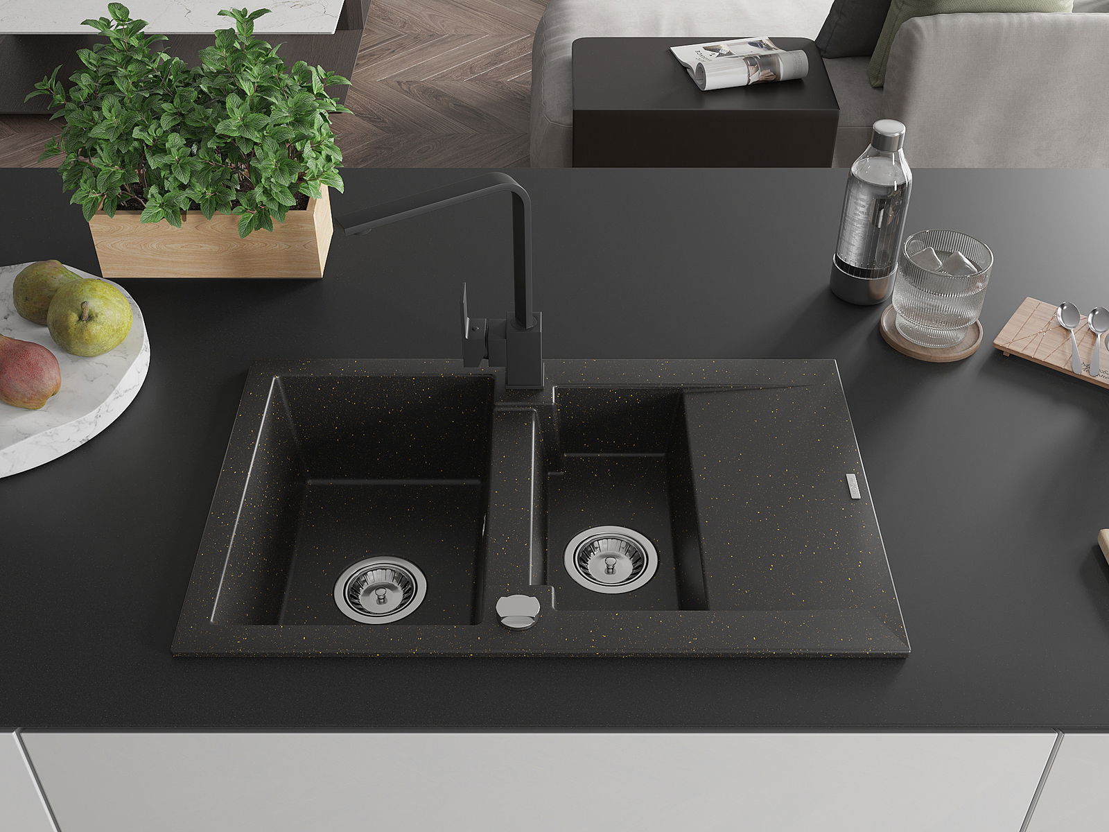 Mexen Gaspar granitový dřez 1,5-komorový s odkapávačem a kuchyňskou baterií Rita, černý/zlatý - 6507-75-670300-70