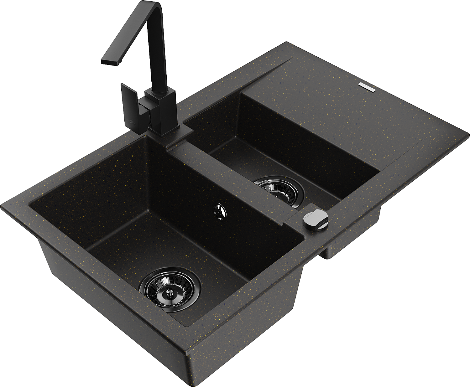 Mexen Gaspar žulový dřez 1,5-komorový s odkapávačem a kuchyňskou baterií Rita, černý/zlatý - 6507-75-670300-70-B