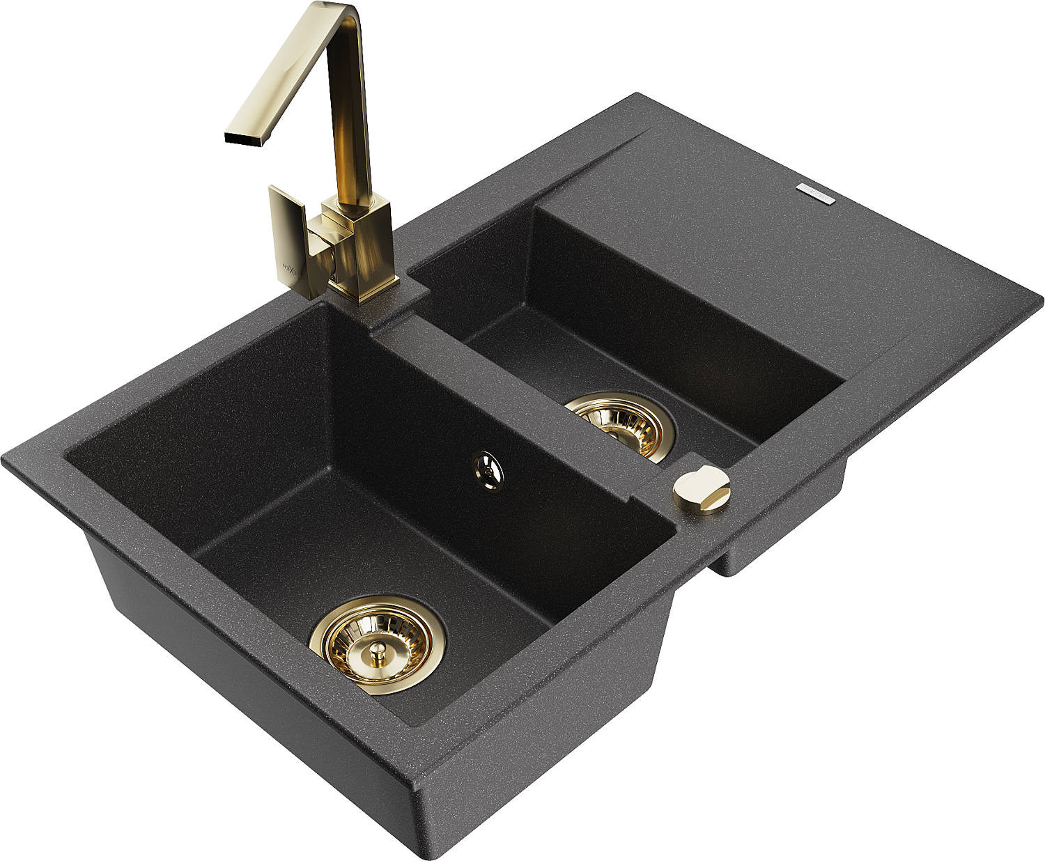 Mexen Gaspar granitový dřez 1,5-komorový s odkapávačem a kuchyňskou baterií Rita, černý skvrnitý - 6507-76-670300-50
