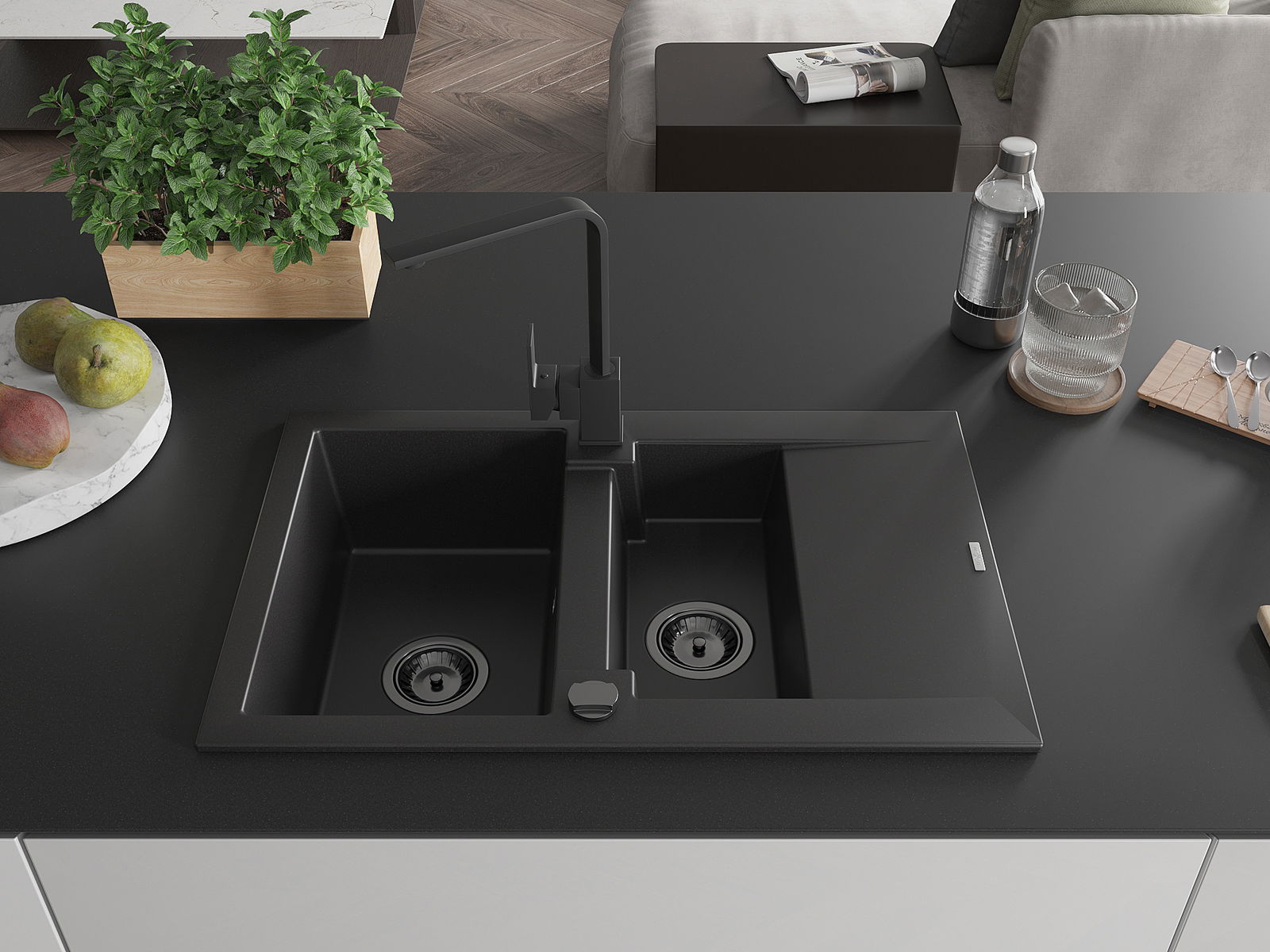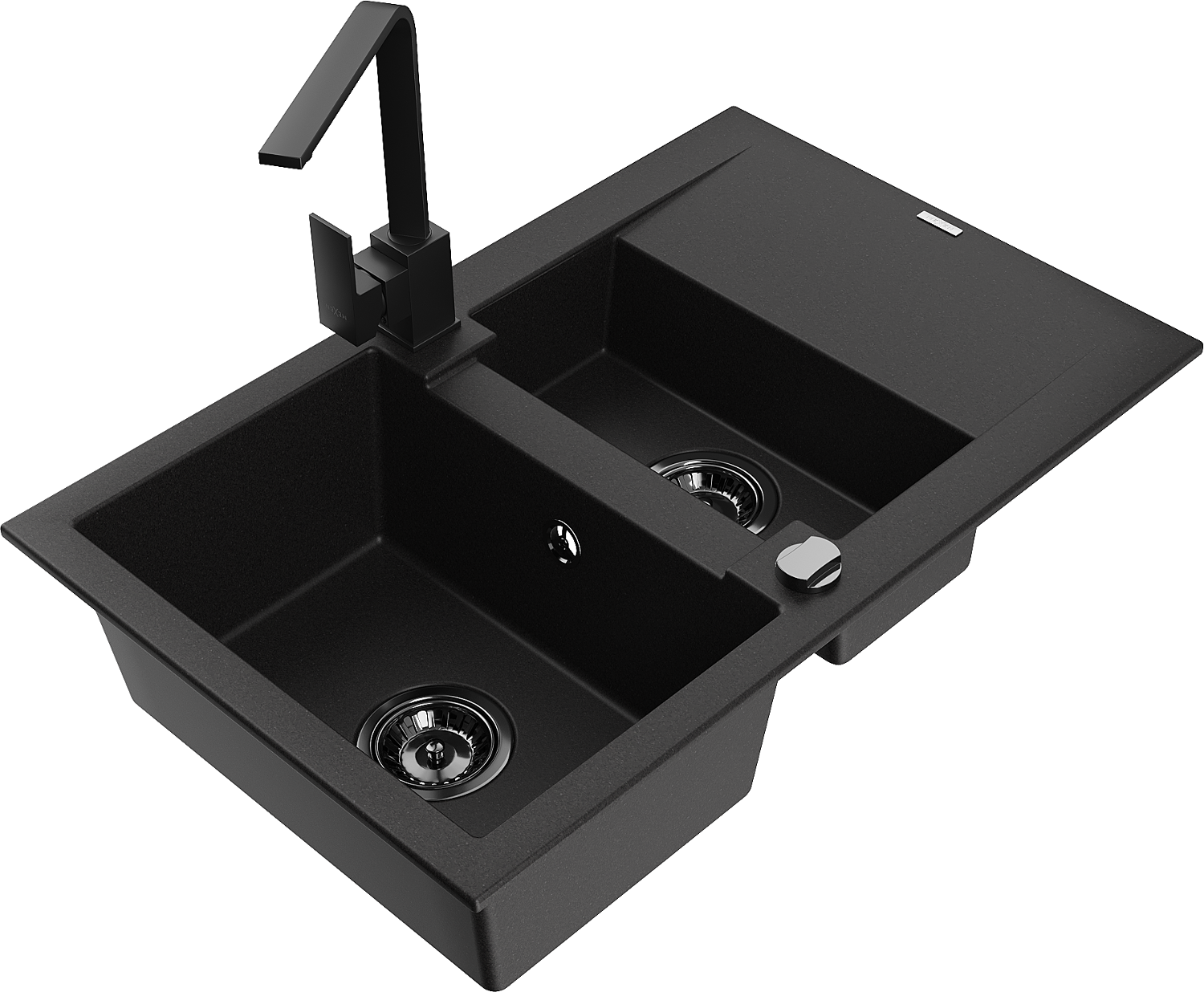 Mexen Gaspar granitový dřez 1,5 komorový s odkapávačem a kuchyňskou baterií Rita, černý - 6507-77-670300-70-B