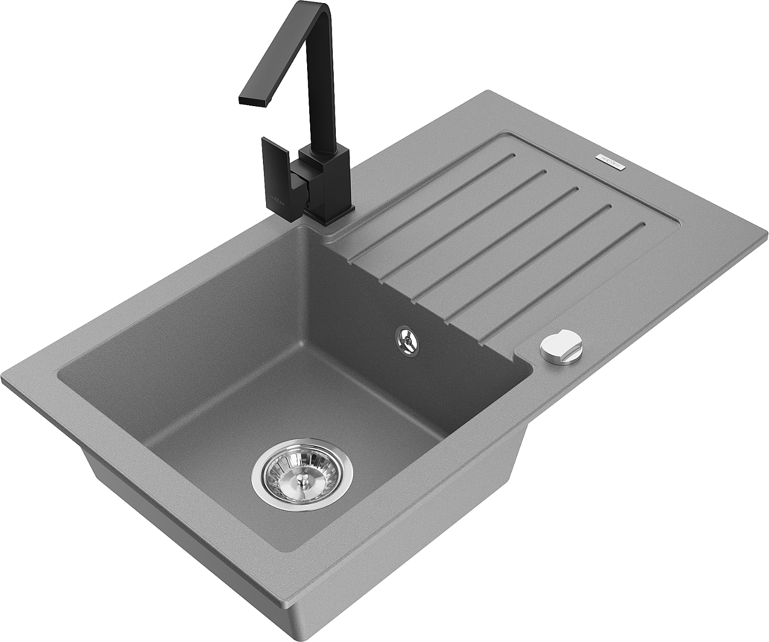Mexen Pablo granitový kuchyňský dřez 1-komorový s odkapávačem a kuchyňskou baterií Rita, šedý - 6510-71-670300-70