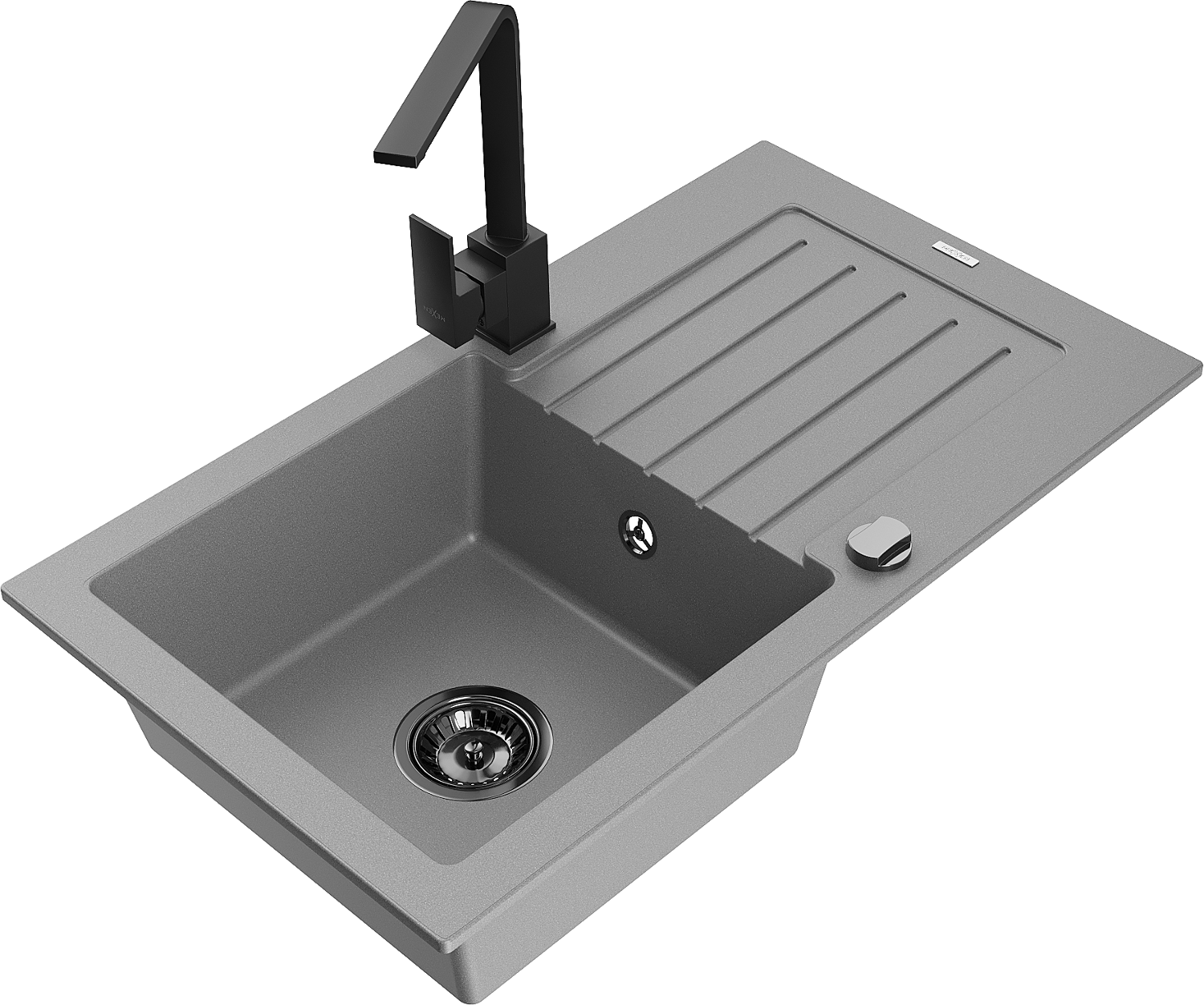 Mexen Pablo jedinečný granitový dřez s 1 komorou a odkapávačem a kuchyňskou baterií Rita, šedý - 6510-71-670300-70-B