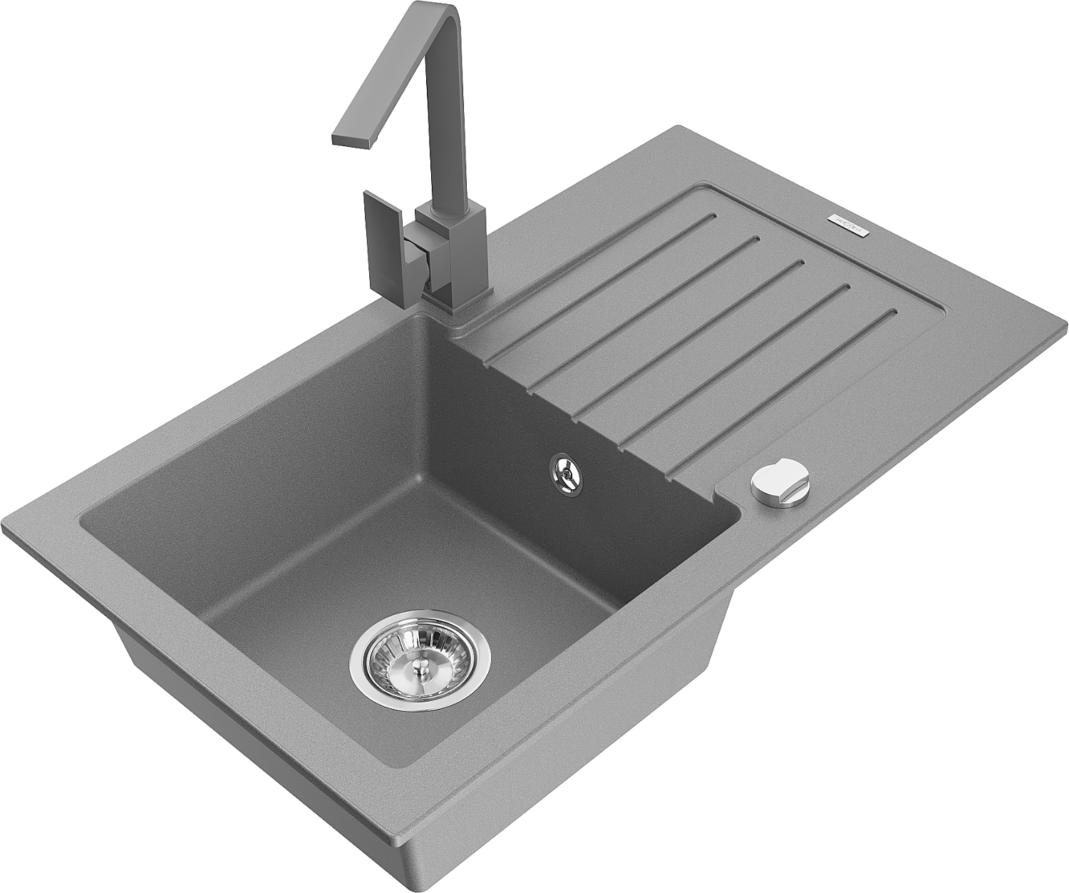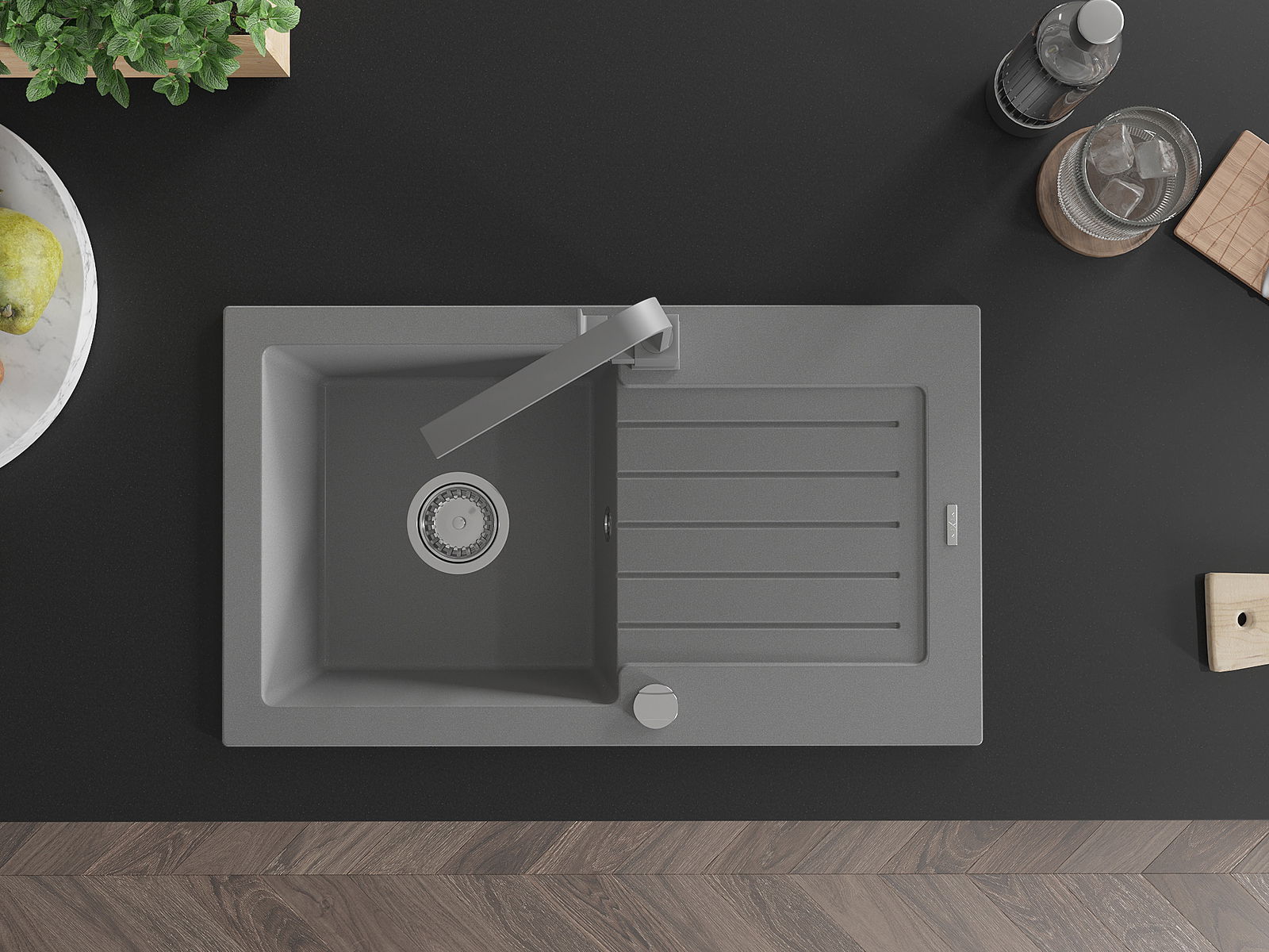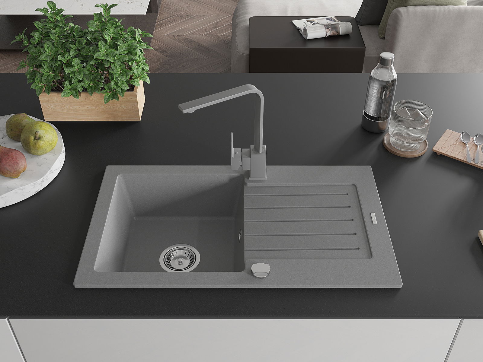 Mexen Pablo jednodřezový granitový dřez s odkapávačem a kuchyňskou baterií Rita, šedý - 6510-71-670300-71