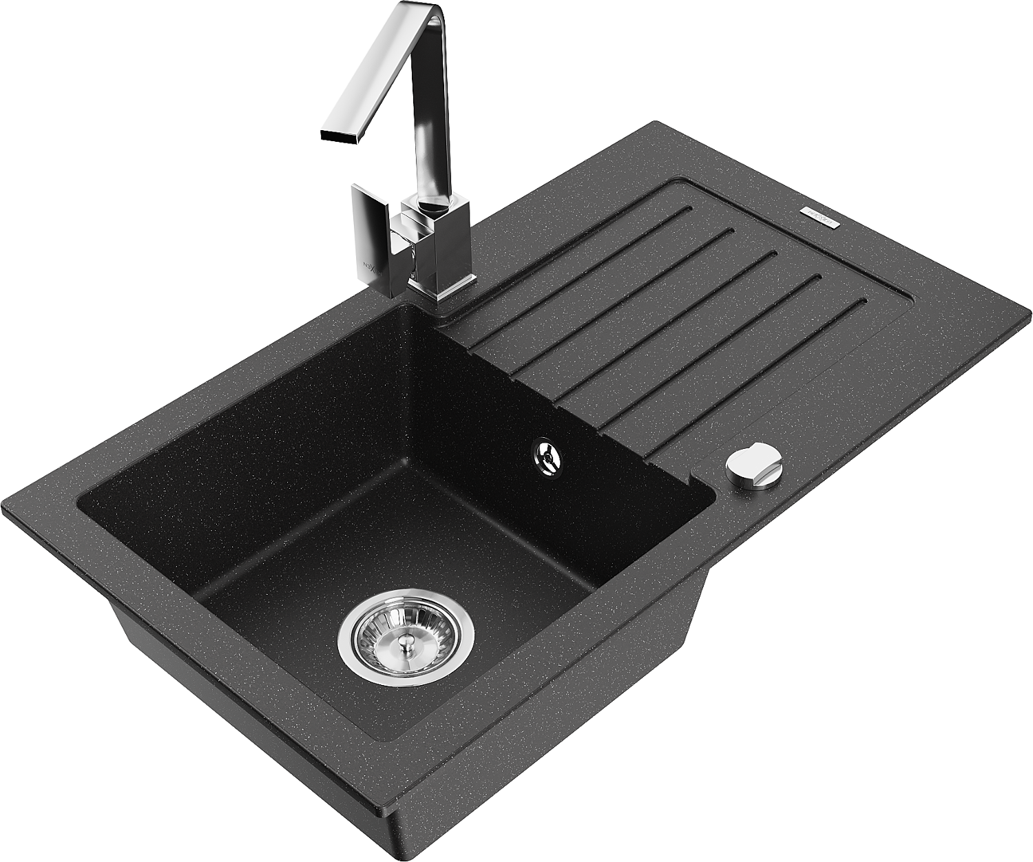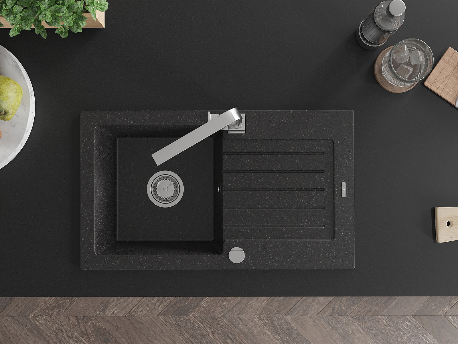 Mexen Pablo žulový dřez 1-komorový s odkapem a kuchyňskou baterií Rita, černý/stříbrný metalický- 6510-73-670300-00