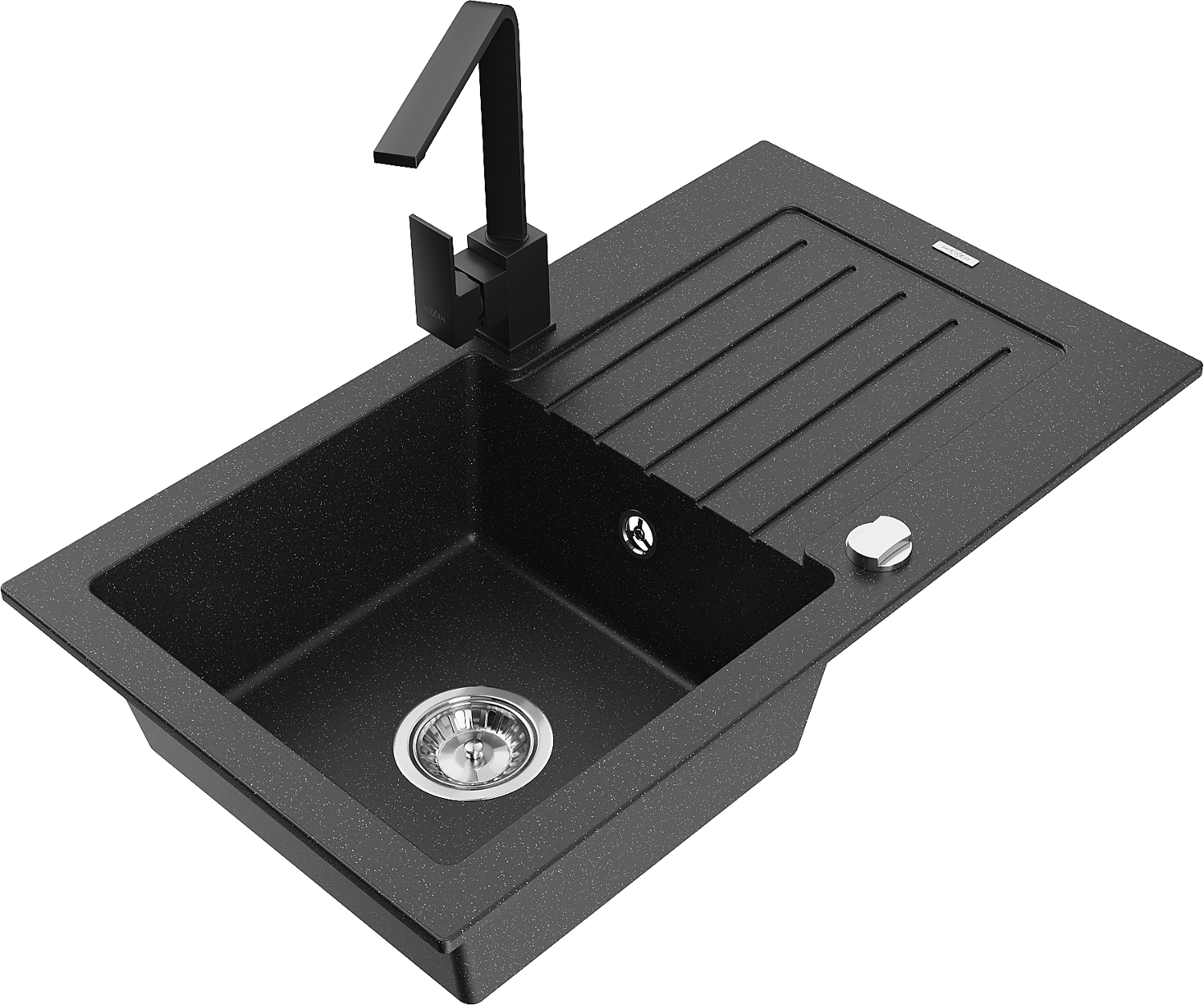 Mexen Pablo granitový dřez 1-komorový s odkapávačem a kuchyňskou baterií Rita, černý/stříbrný metalický - 6510-73-670300-70