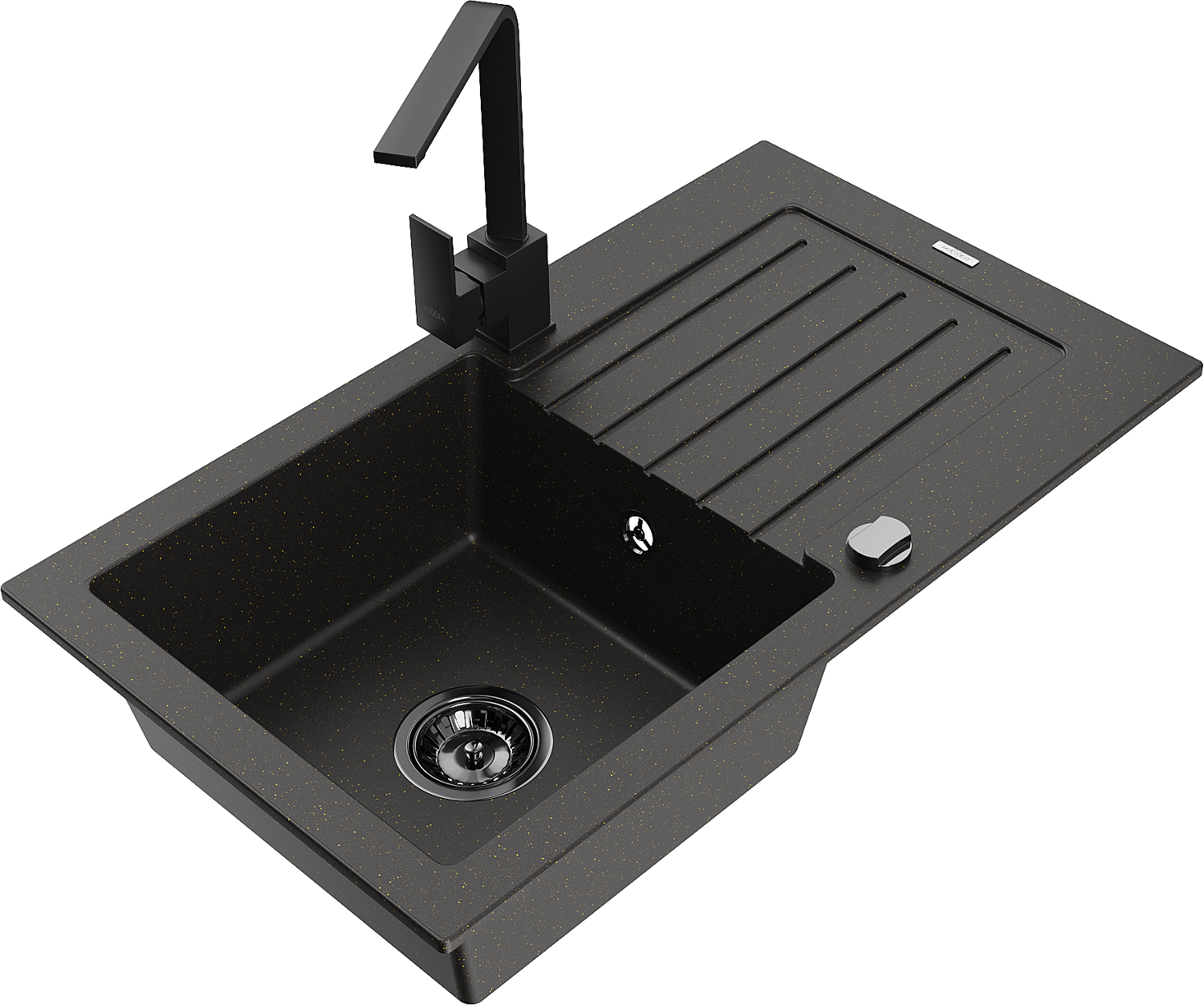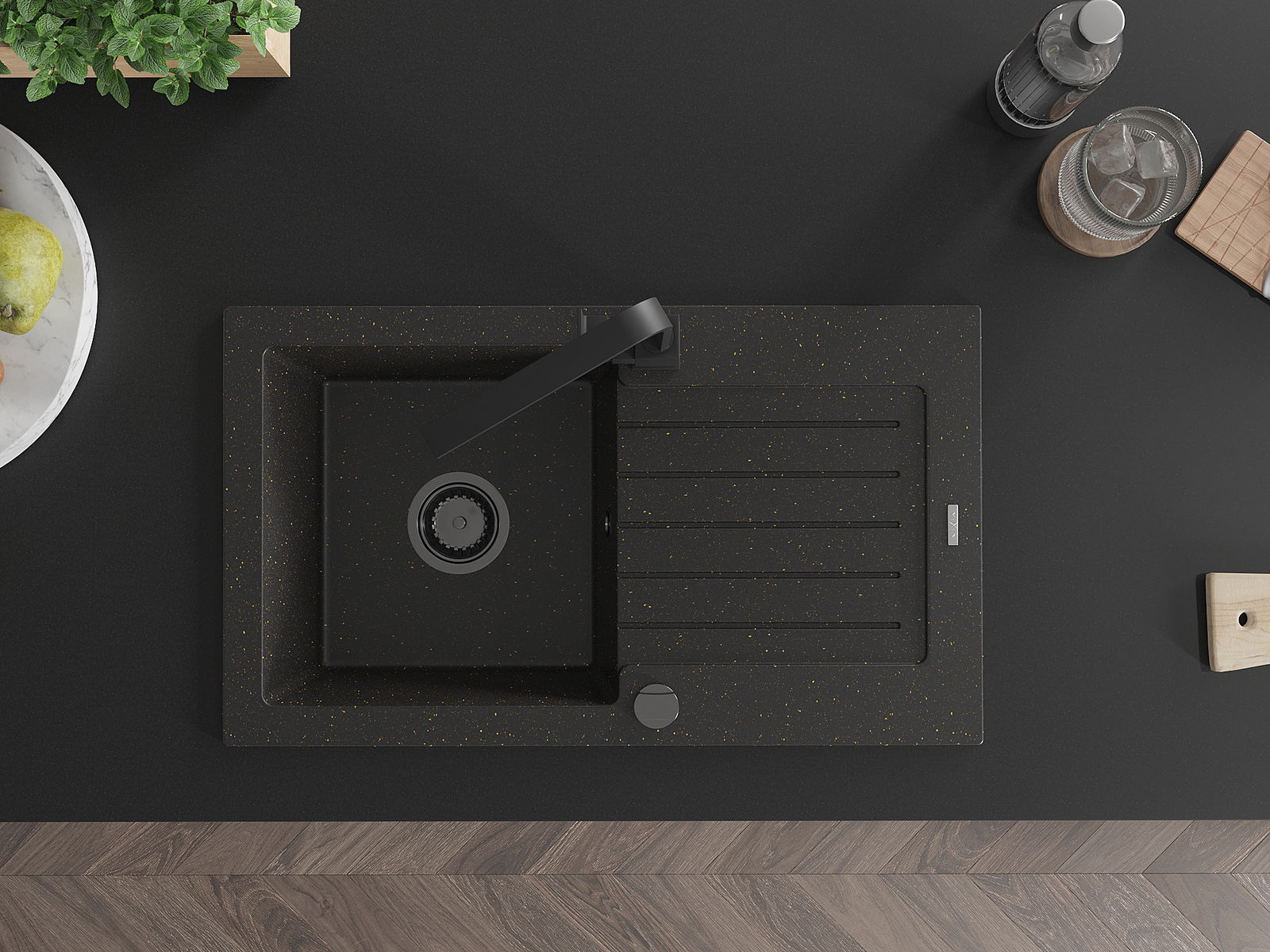 Mexen Pablo granitový dřez s 1 komorou a odkapávačem a kuchyňskou baterií Rita, černý/zlatý metalík- 6510-75-670300-70-B
