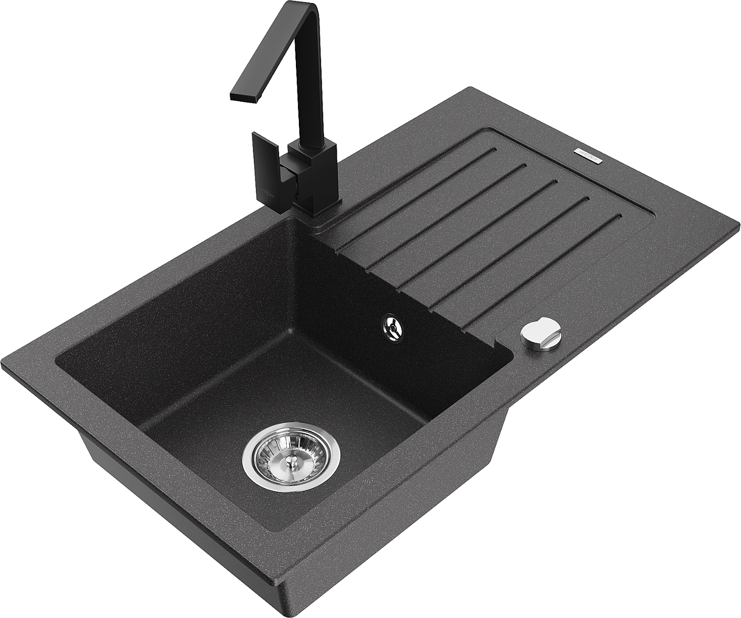 Mexen Pablo granitový dřez 1-komorový s odkapávačem a kuchyňskou baterií Rita, černý s tečkami - 6510-76-670300-70