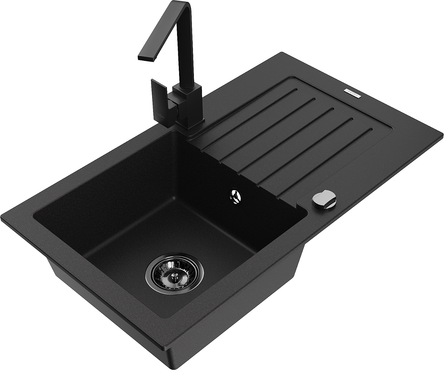 Mexen Pablo granitový dřez 1-komorový s odkapávačem a kuchyňskou baterií Rita, černý - 6510-77-670300-70-B