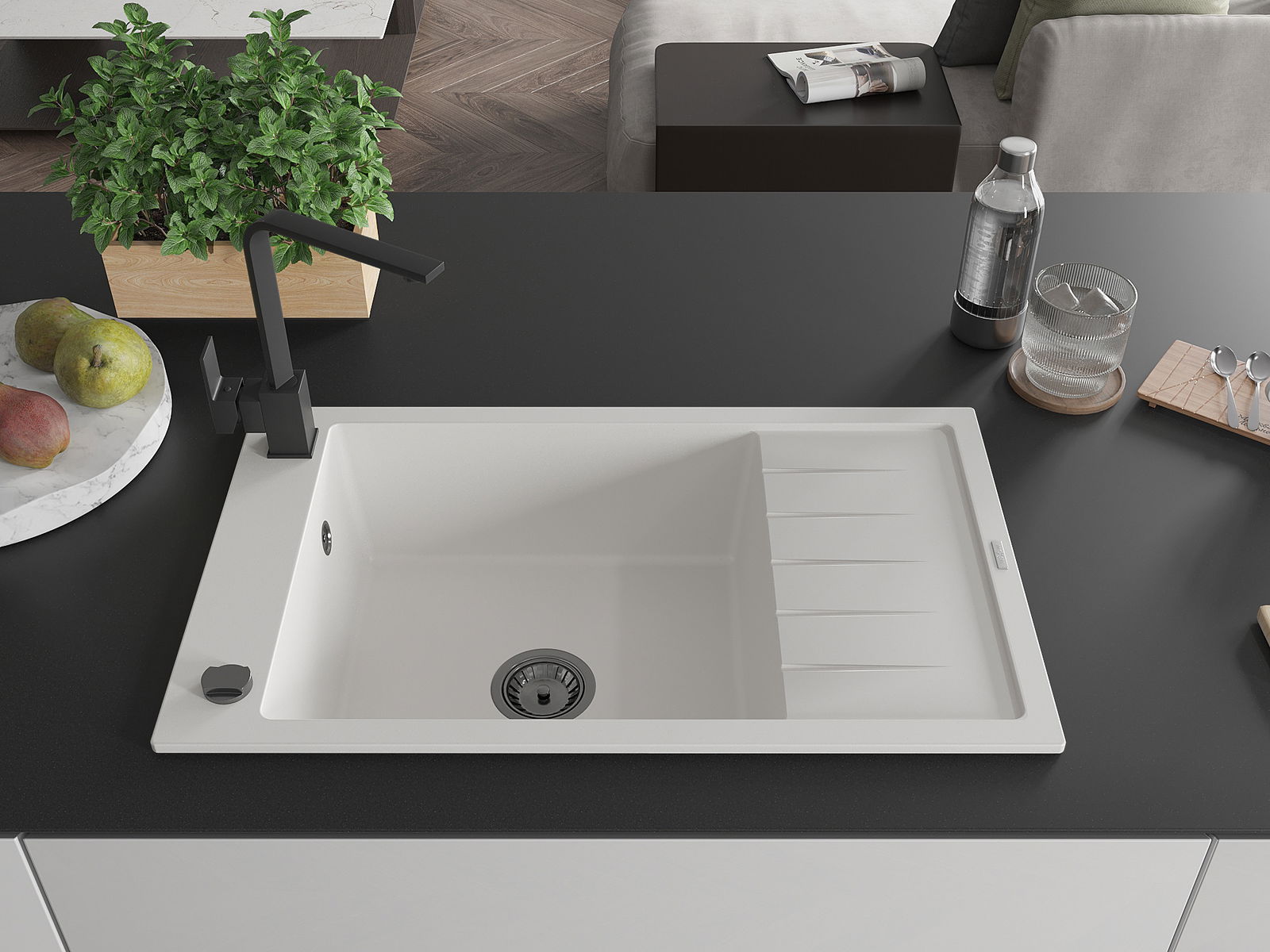 Mexen Elias granitový dřez 1-komorový s odkapávačem a kuchyňskou baterií Rita, bílý - 6511-20-670300-70