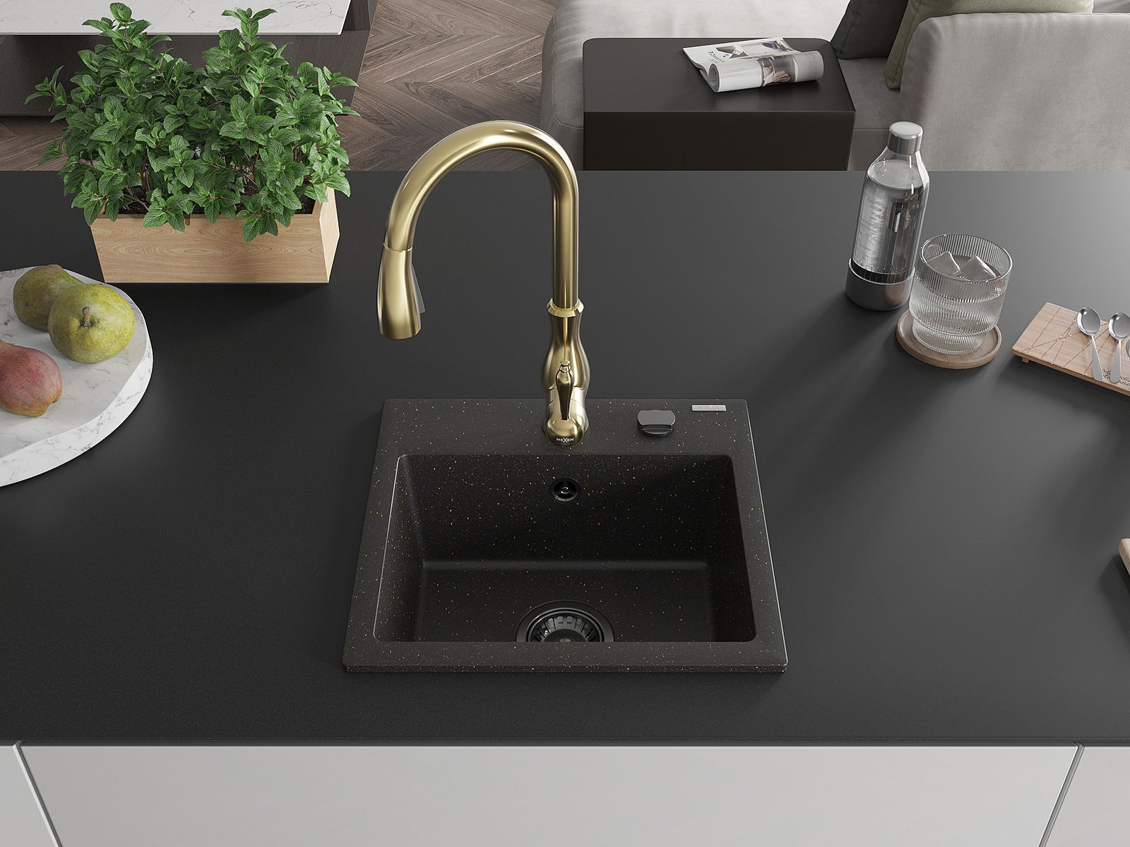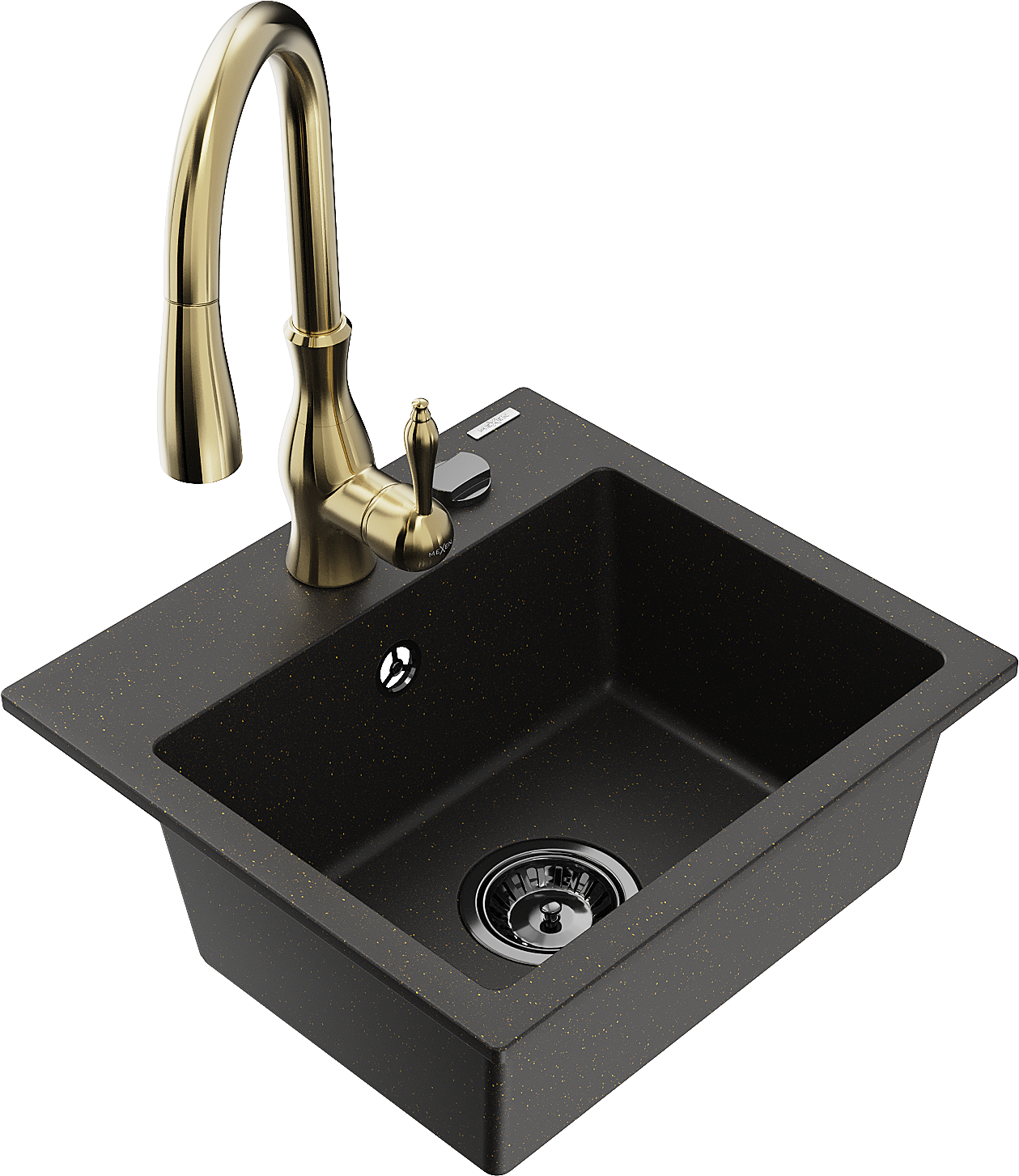 Mexen Milo granitový dřez 1-komorový s kuchyňskou baterií Savita, černý/zlatý metalik - 6505-75-672601-50-B