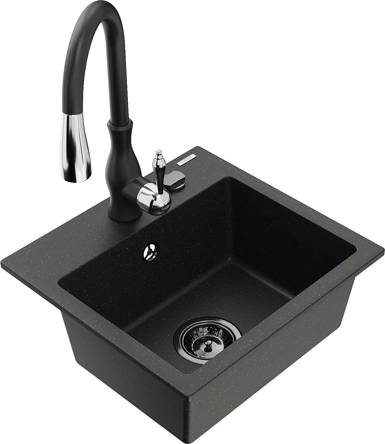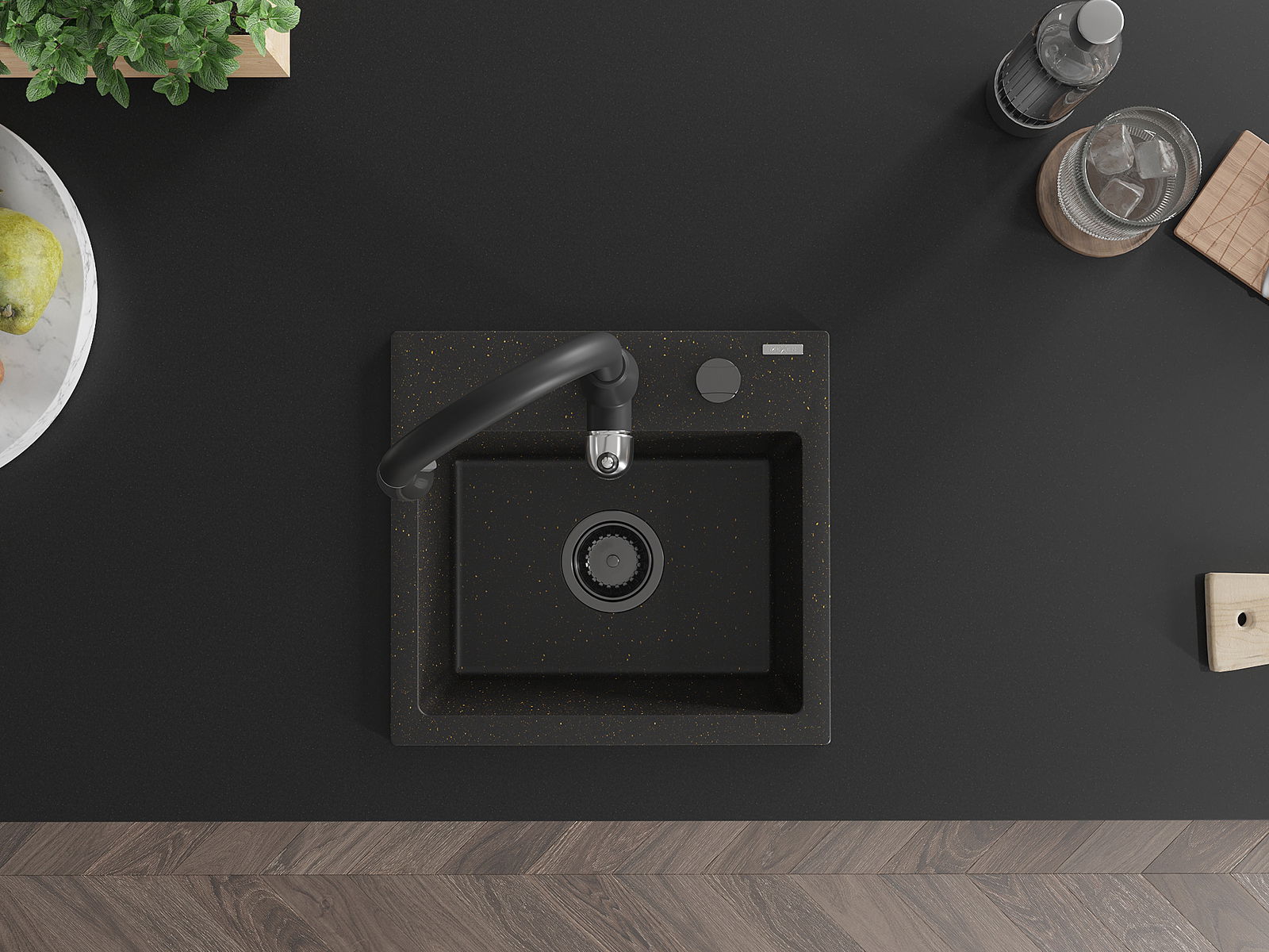 Mexen Milo granitový dřez 1-komorový s kuchyňskou baterií Savita, černý/zlatý metalický- 6505-75-672601-70-B