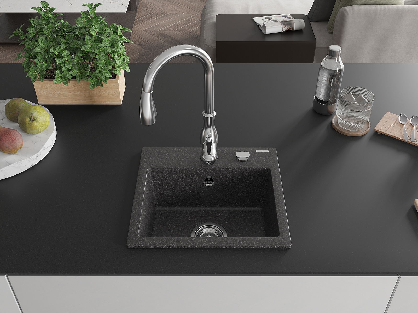 Dřez má předfrézovaný otvor o průměru 35 mm k samostatnému proražení. Může být použit například k montáži dávkovače na tekutinu, který eliminuje přítomnost plastových lahví v kuchyni a dodá jí elegantní finiš.