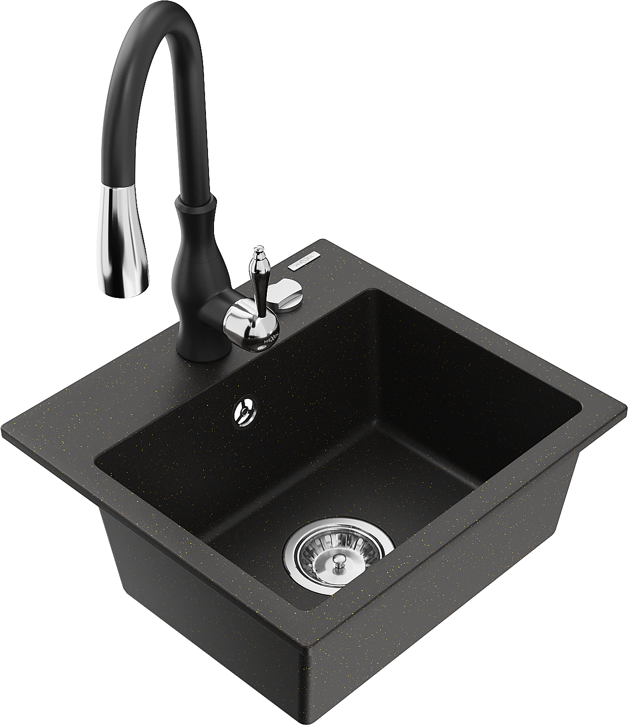 Mexen Milo granitový dřez 1-komorový s kuchyňskou baterií Savita, černý/zlatý metalik - 6505-75-672601-70
