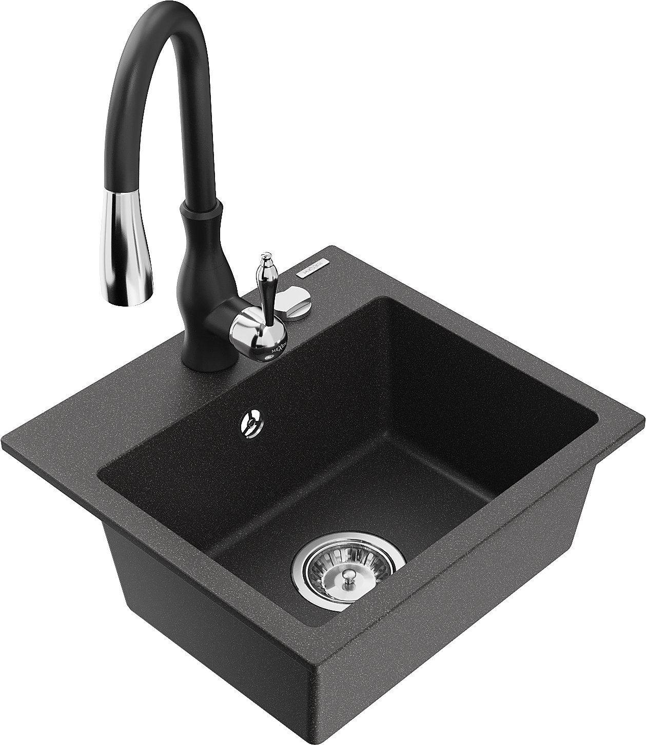 Mexen Milo granitový dřez 1-komorový s kuchyňskou baterií Savita, černý s tečkami - 6505-76-672601-70
