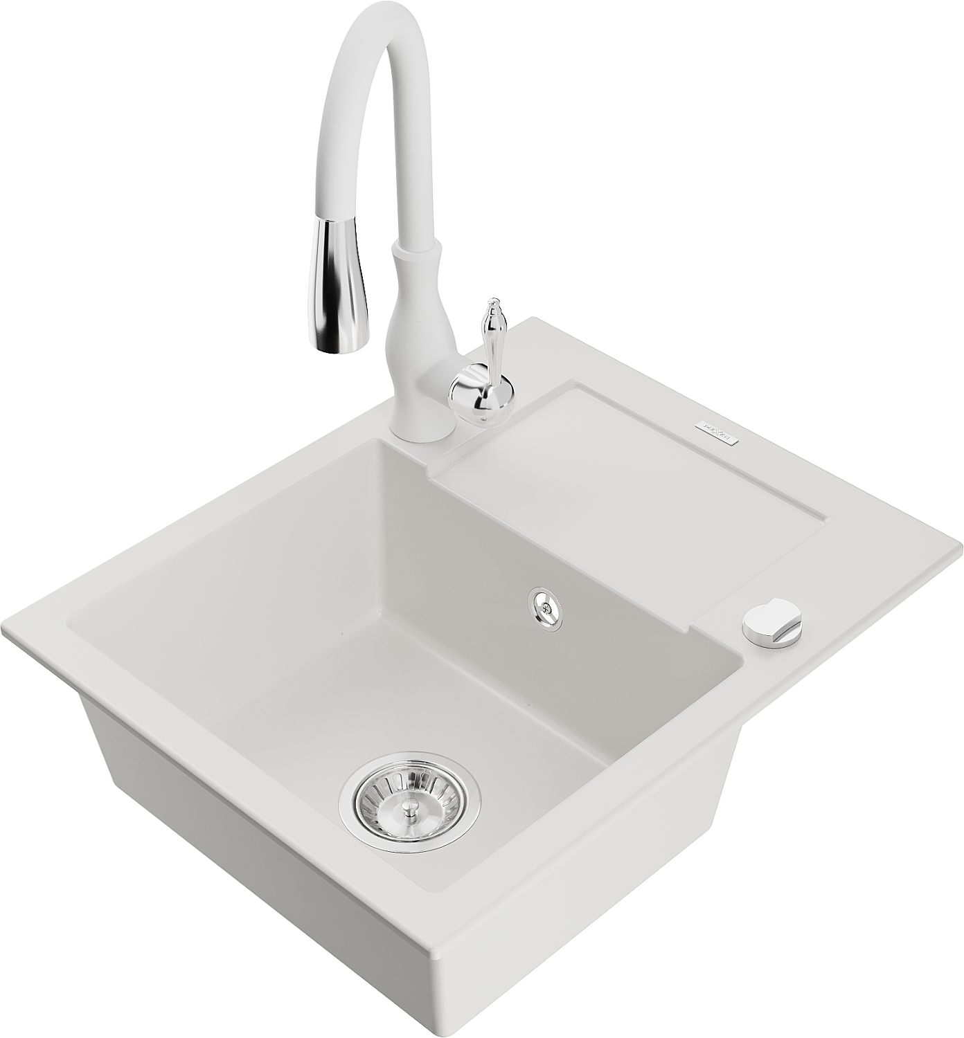 Mexen Enzo granitový dřez 1-komorový s odkapávačem a kuchyňskou baterií Savita, bílý - 6506-20-672601-20