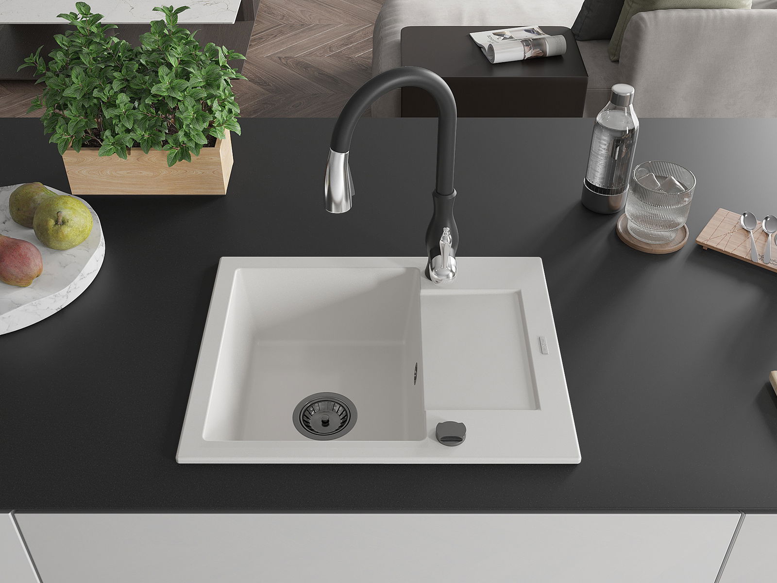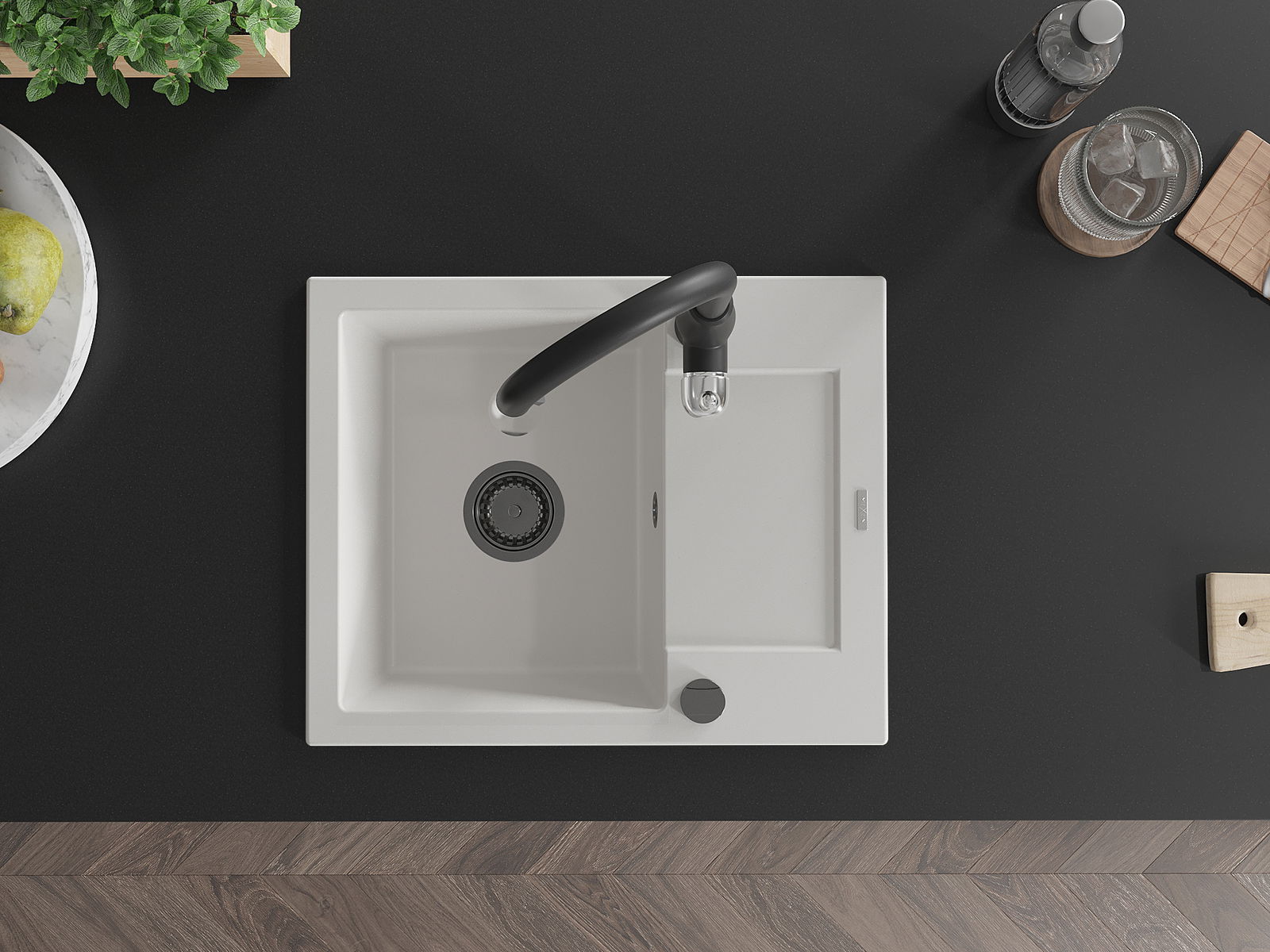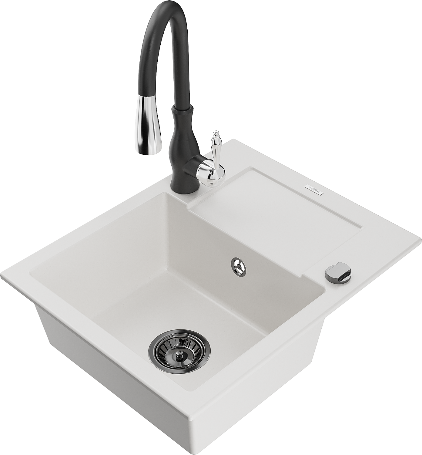 Mexen Enzo žulový dřez s jednou komorou s odkapávačem a kuchyňskou baterií Savita, bílý - 6506-20-672601-70