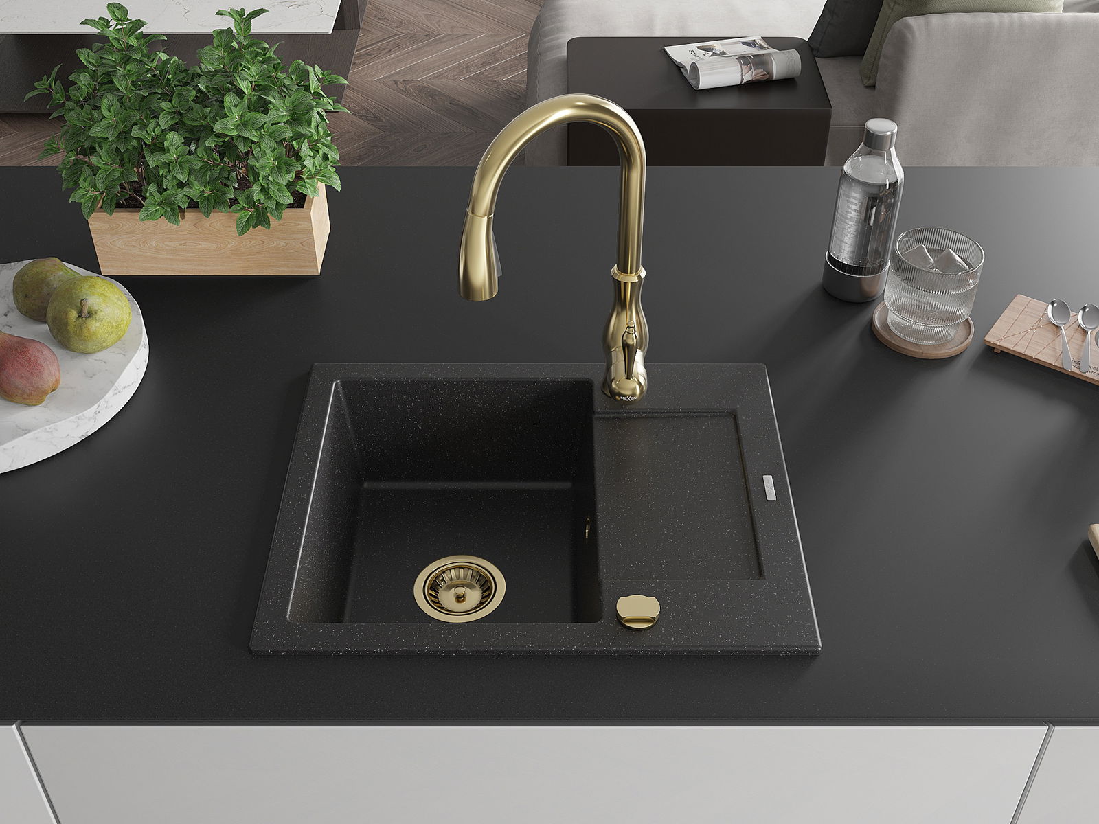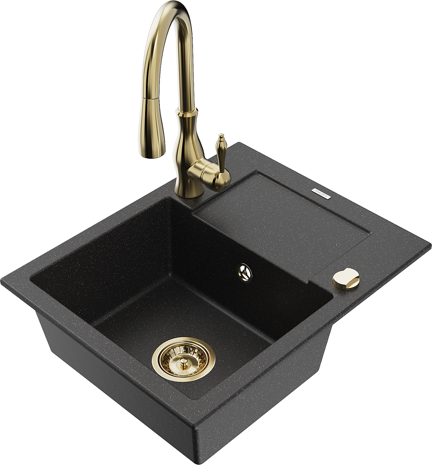 Mexen Enzo granitový dřez 1-komorový s odkapávačem a kuchyňskou baterií Savita, černý/stříbrný metalik - 6506-73-672601-50