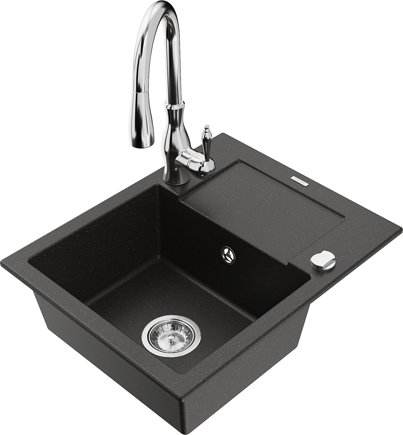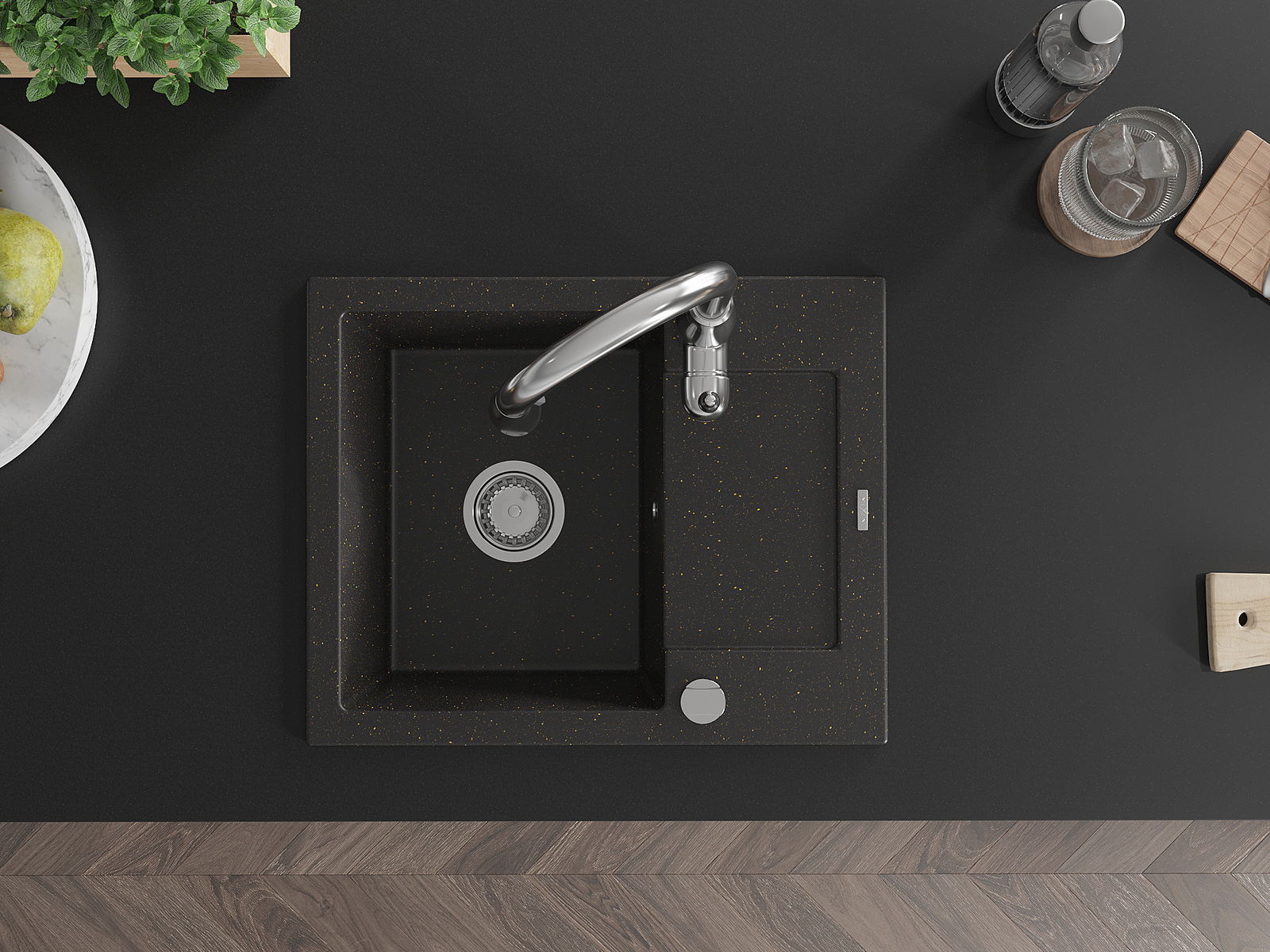 Mexen Enzo granitový dřez jednokomorový s odkapávačem a kuchyňskou baterií Savita, černý/zlatý metalik - 6506-75-672601-00