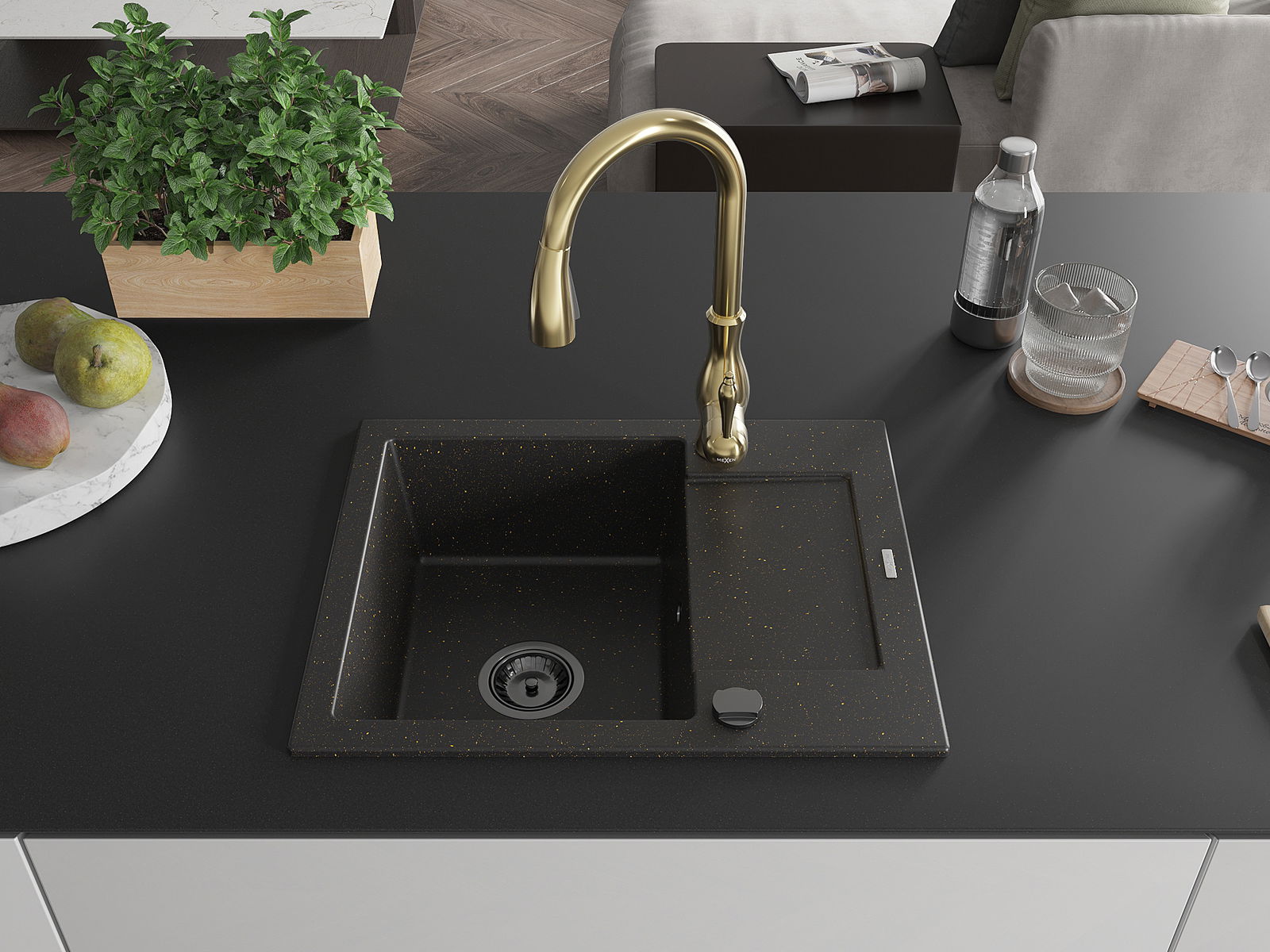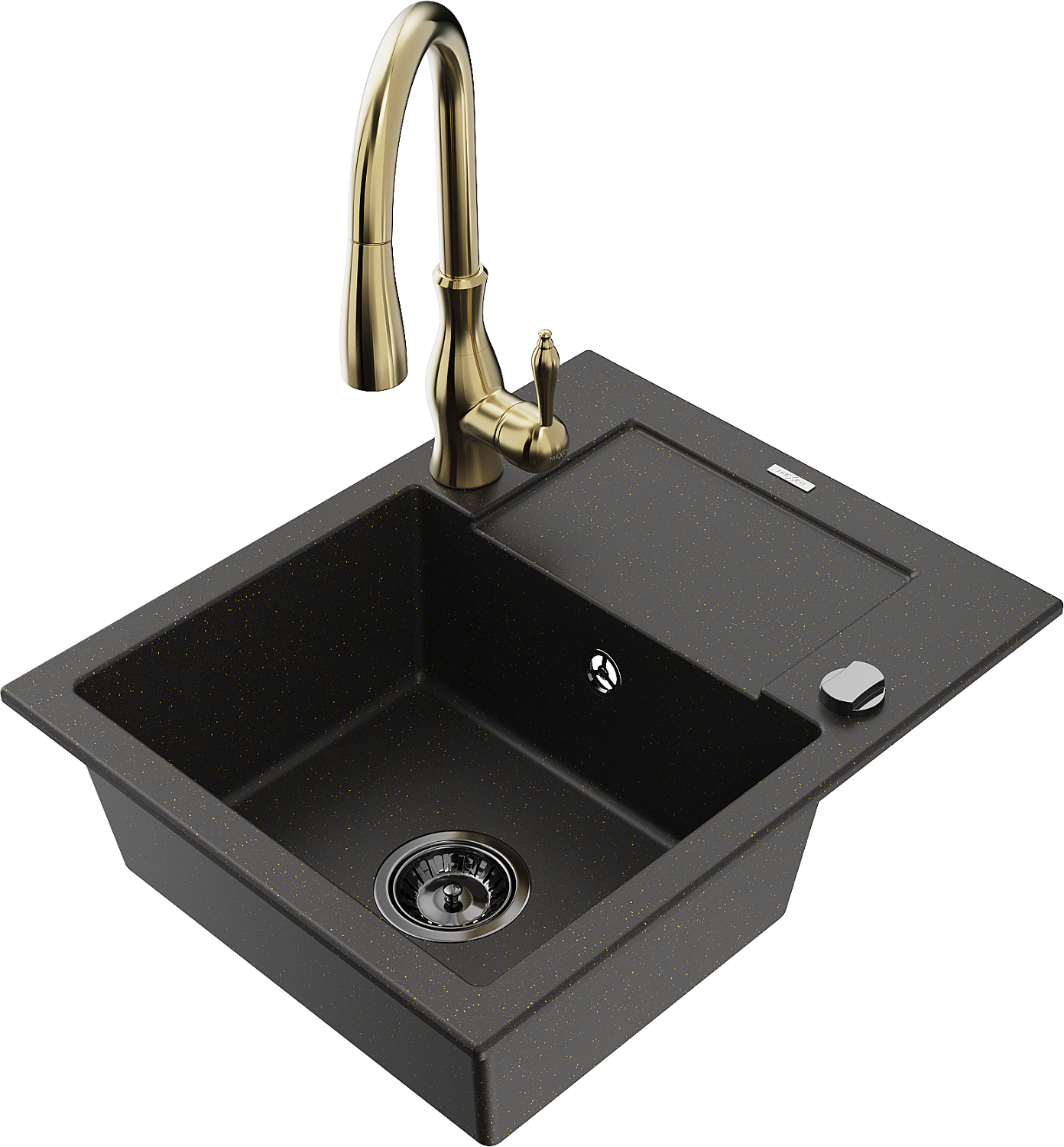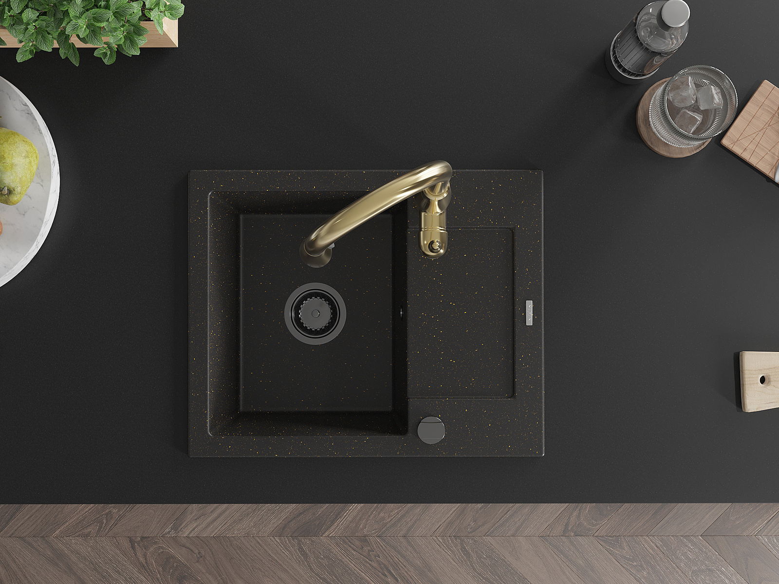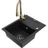 Mexen Enzo granitový dřez 1-komorový s odkapávačem a kuchyňskou baterií Savita, černý/zlatý metalický - 6506-75-672601-50-B