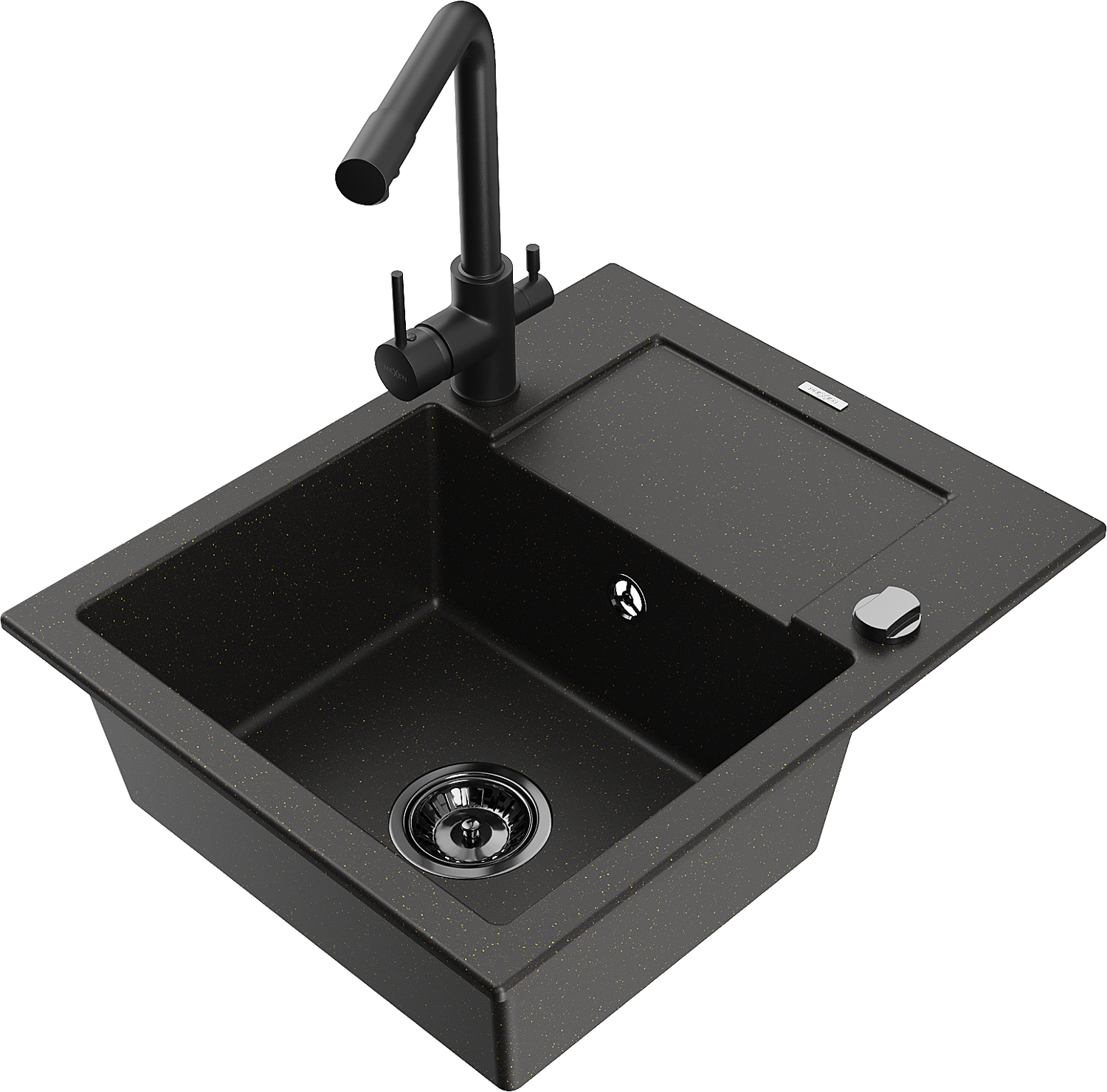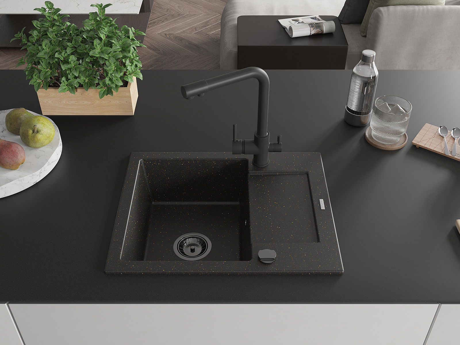 Mexen Enzo granitový dřez 1-komorový s odkapávačem a kuchyňskou baterií Duero, černý/zlatý metalik - 6506-75-671600-70-B