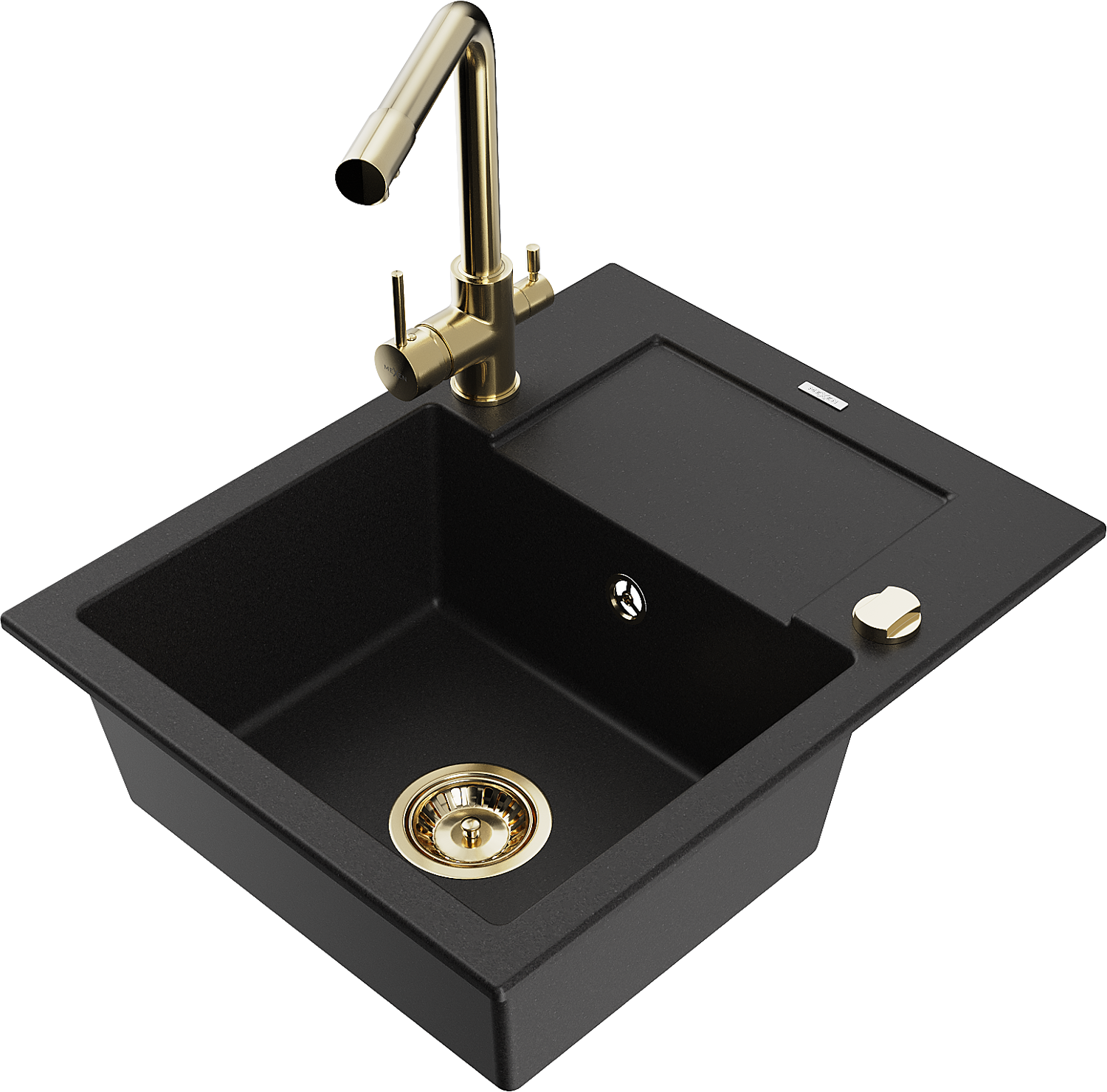 Mexen Enzo granitový dřez 1-komorový s odkapávačem a kuchyňskou baterií Duero, černý - 6506-77-671600-50