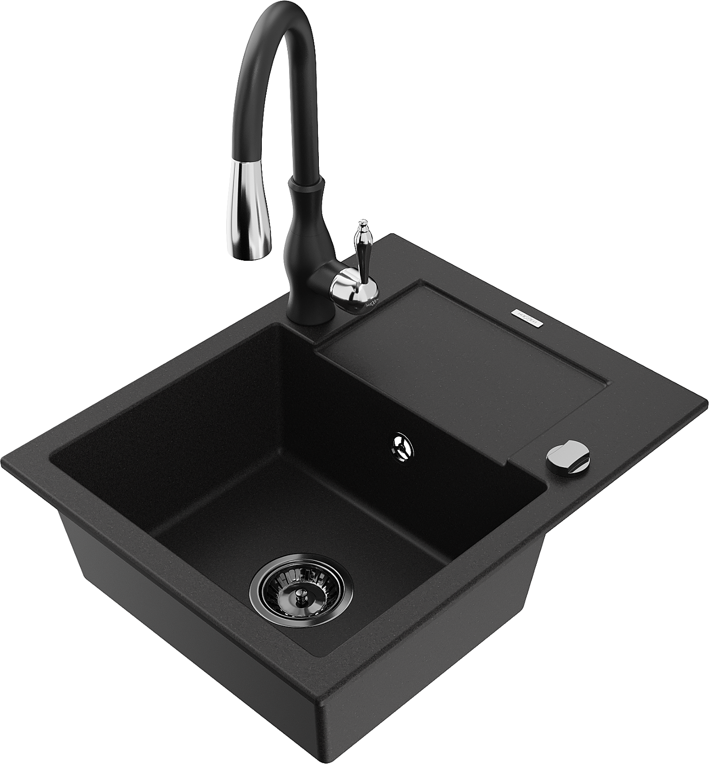 Mexen Enzo granitový dřez 1-komorový s odkapávačem a kuchyňskou baterií Savita, černý - 6506-77-672601-70-B
