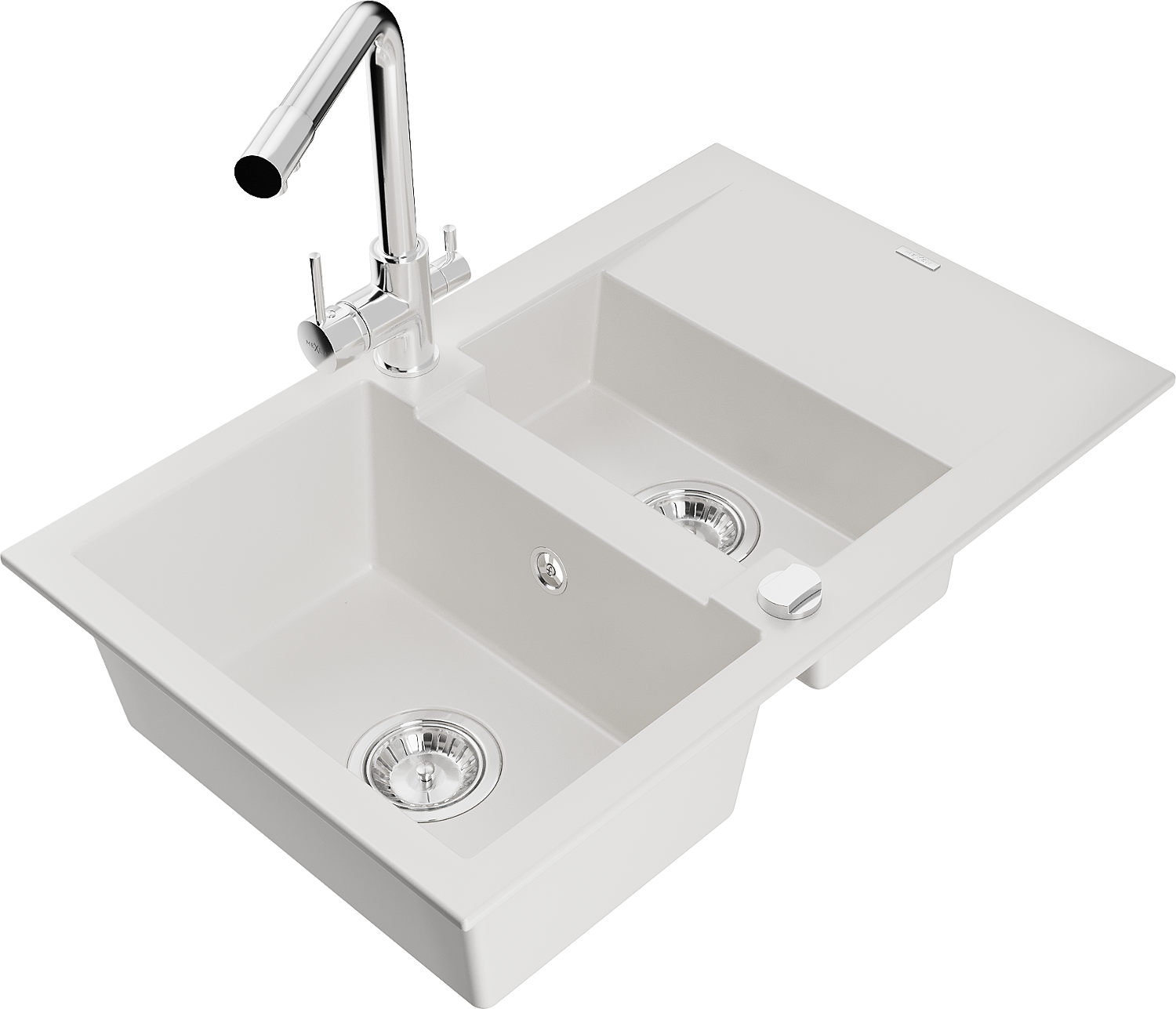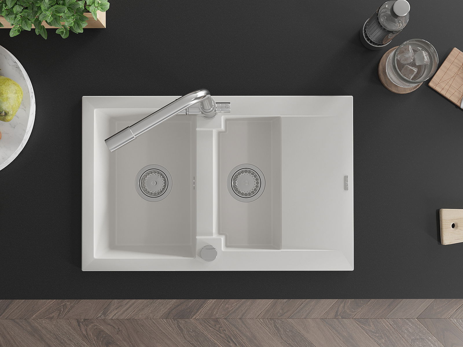 Mexen Gaspar granitový dřez 1,5-komorový s odkapávačem a kuchyňskou baterií Duero, bílý - 6507-20-671600-00