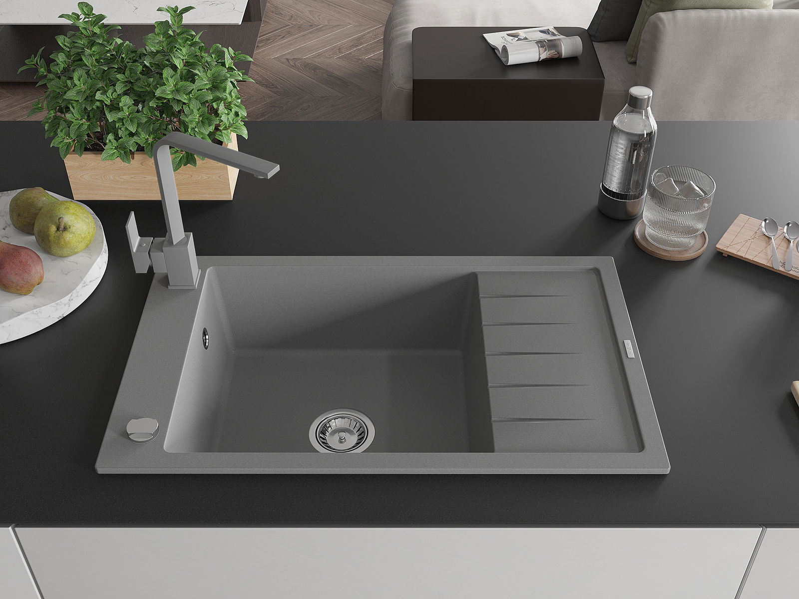 Mexen Elias granitový dřez 1-komorový s odkapávačem a kuchyňskou baterií Rita, šedý - 6511-71-670300-71