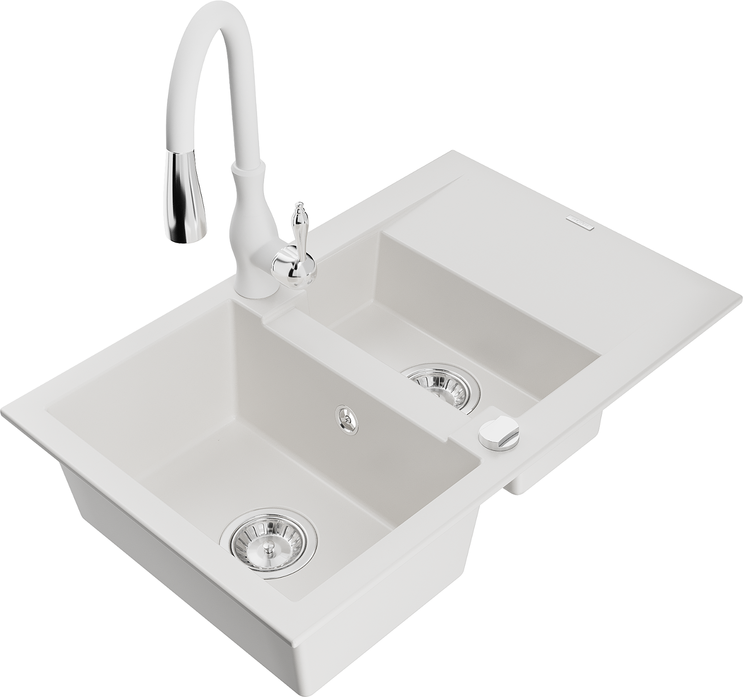 Mexen Gaspar žulový dřez 1,5-komorový s odkapávačem a kuchyňskou baterií Savita, bílý - 6507-20-672601-20