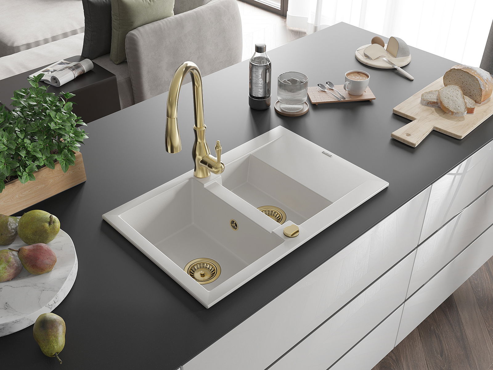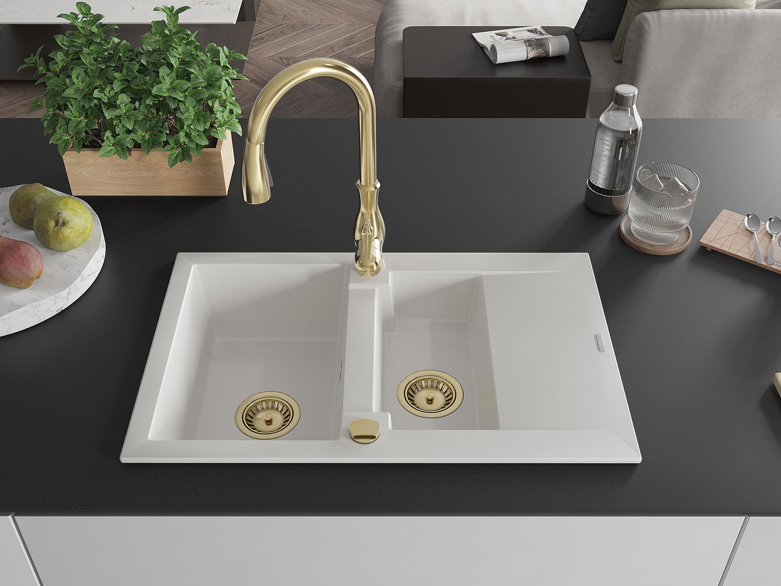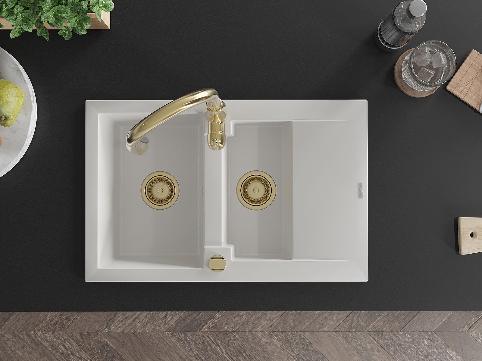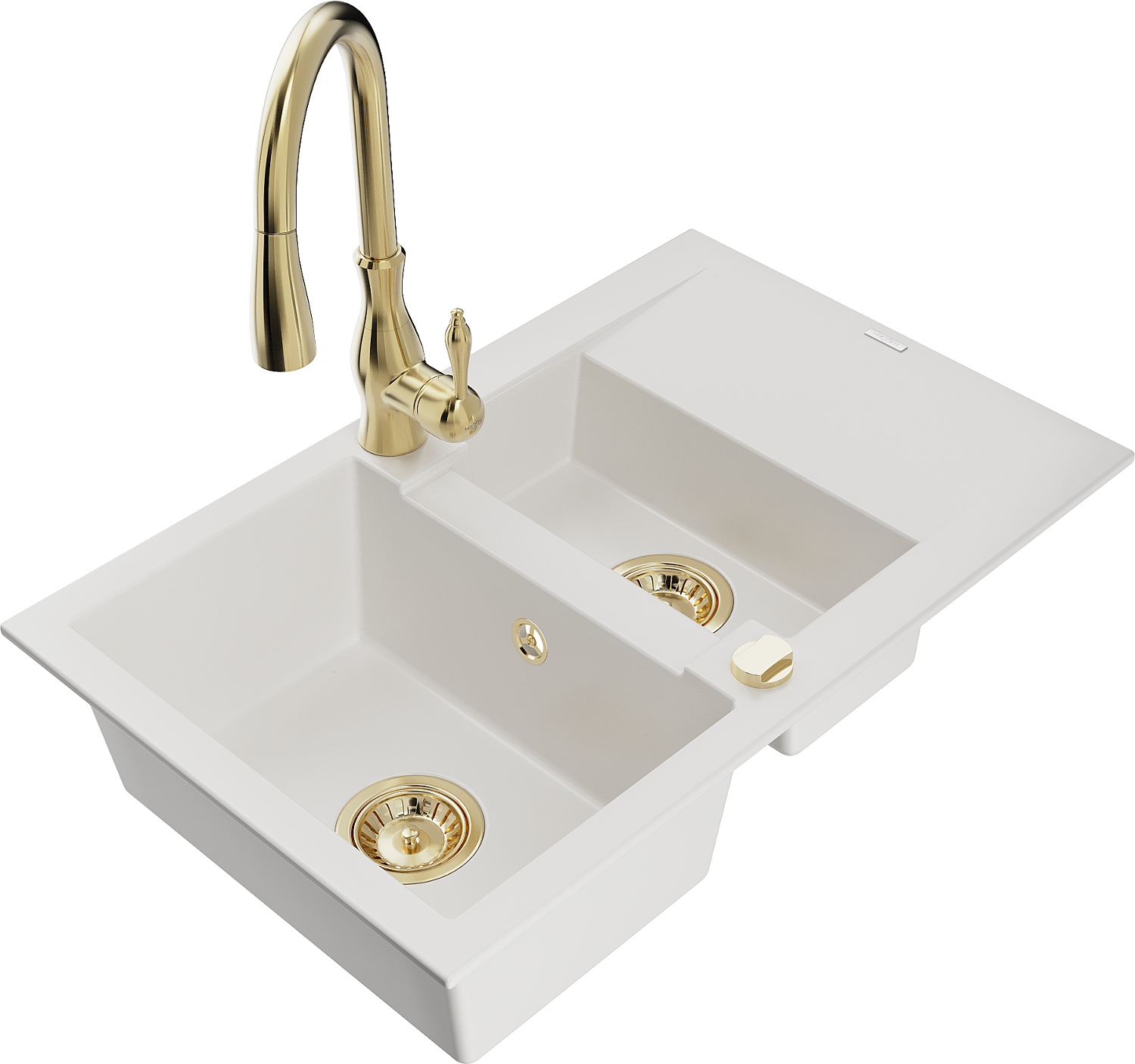 Mexen Gaspar granitový dřez 1,5-komorový s odkapávačem a kuchyňskou baterií Savita, bílý - 6507-20-672601-50