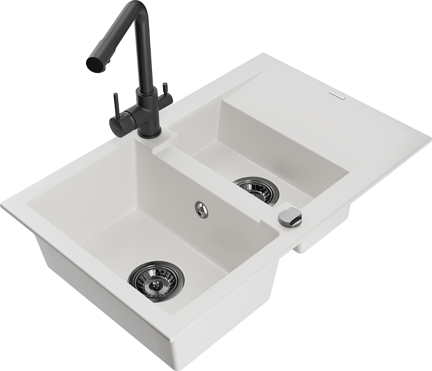Mexen Gaspar granitový dřez 1,5-komorový s odkapávačem a kuchyňskou baterií Duero, bílý - 6507-20-671600-70