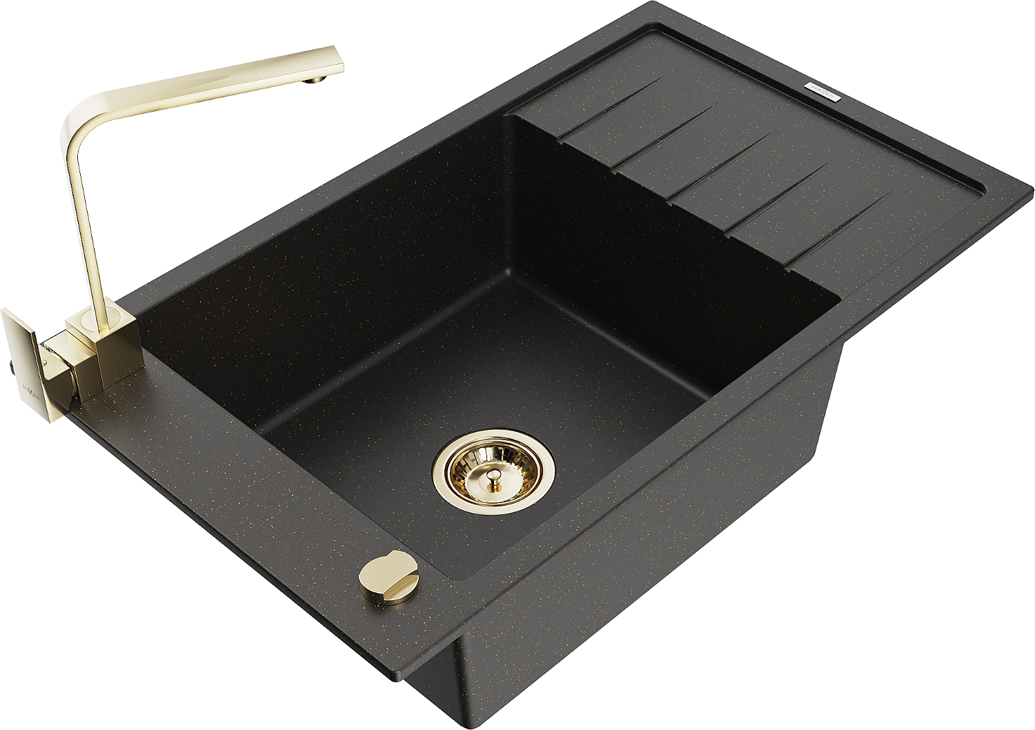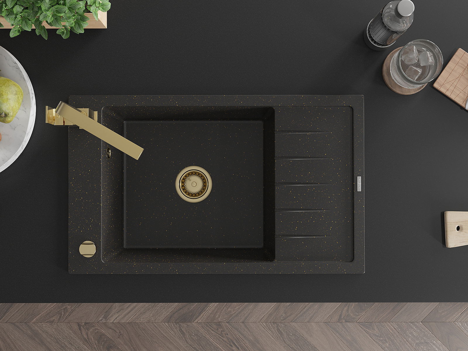 Mexen Elias granitový dřez 1-komorový s odkapávačem a kuchyňskou baterií Rita, černý/zlatý metalický - 6511-75-670300-50