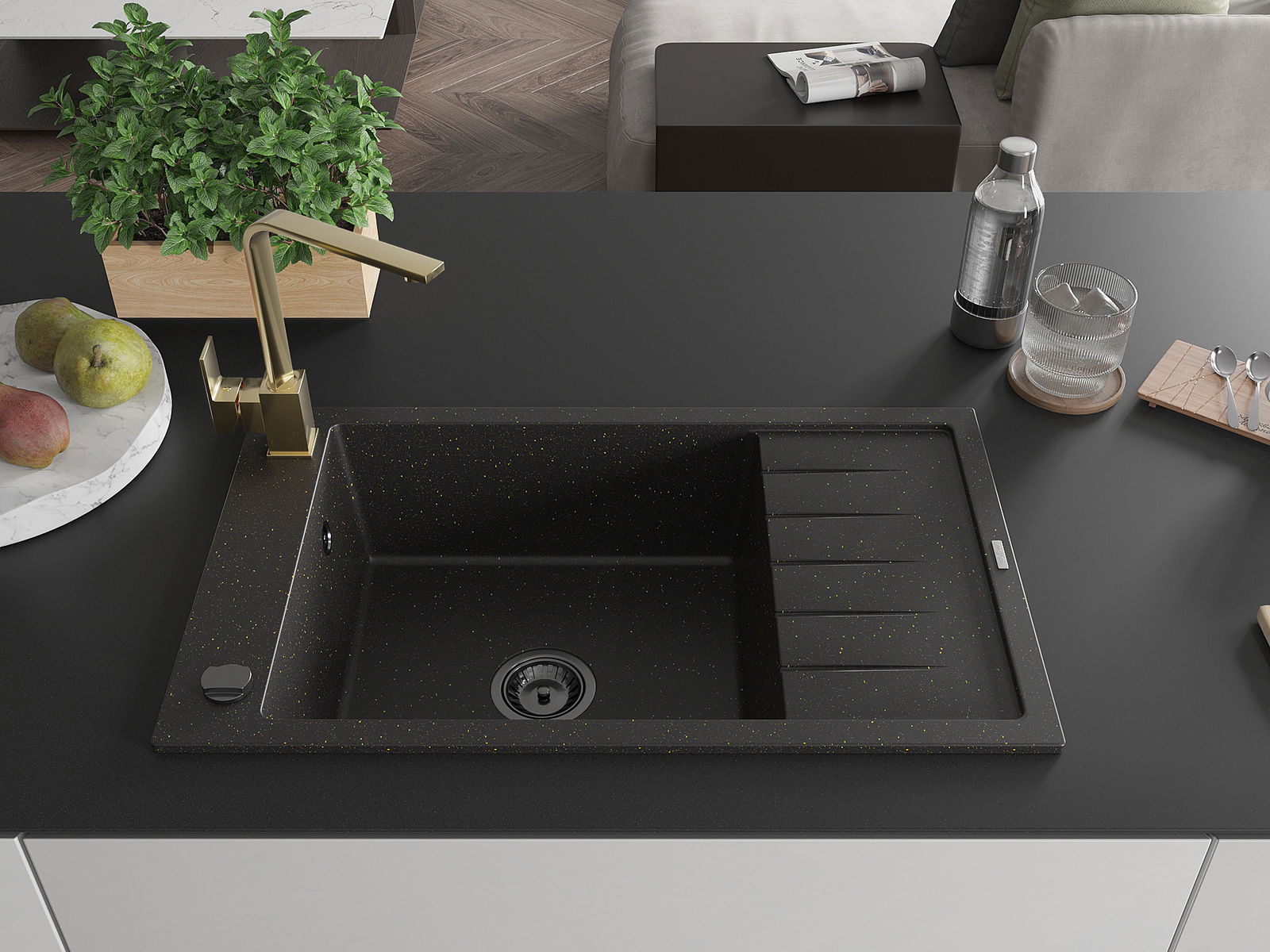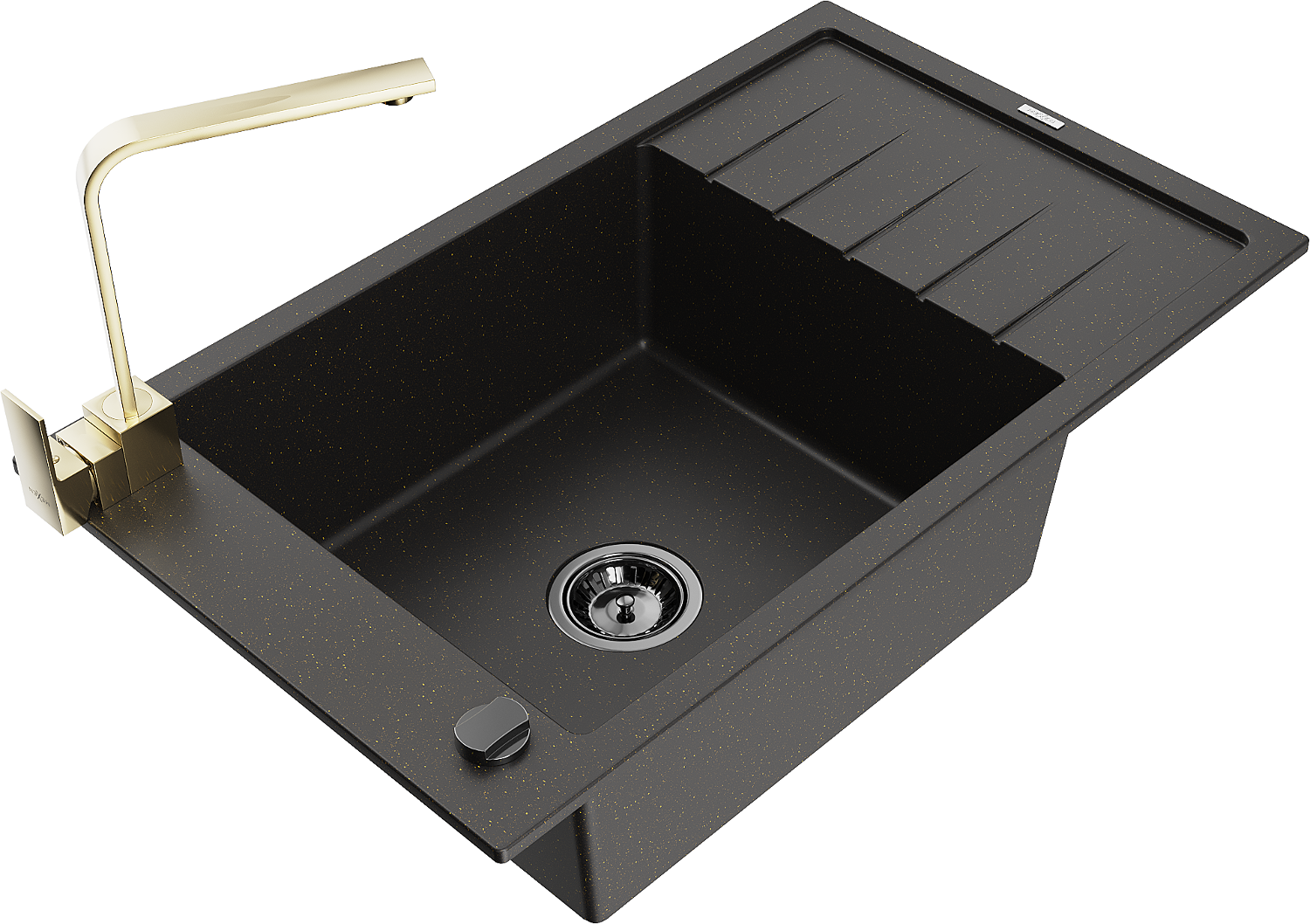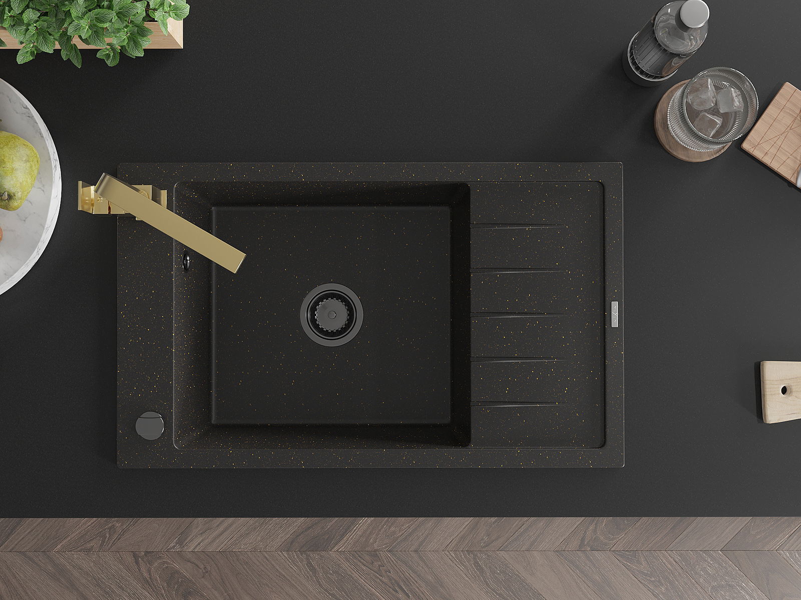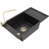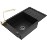 Mexen Elias granitový dřez 1-komorový s odkapávačem a kuchyňskou baterií Rita, černý/zlatý metalický - 6511-75-670300-50-B