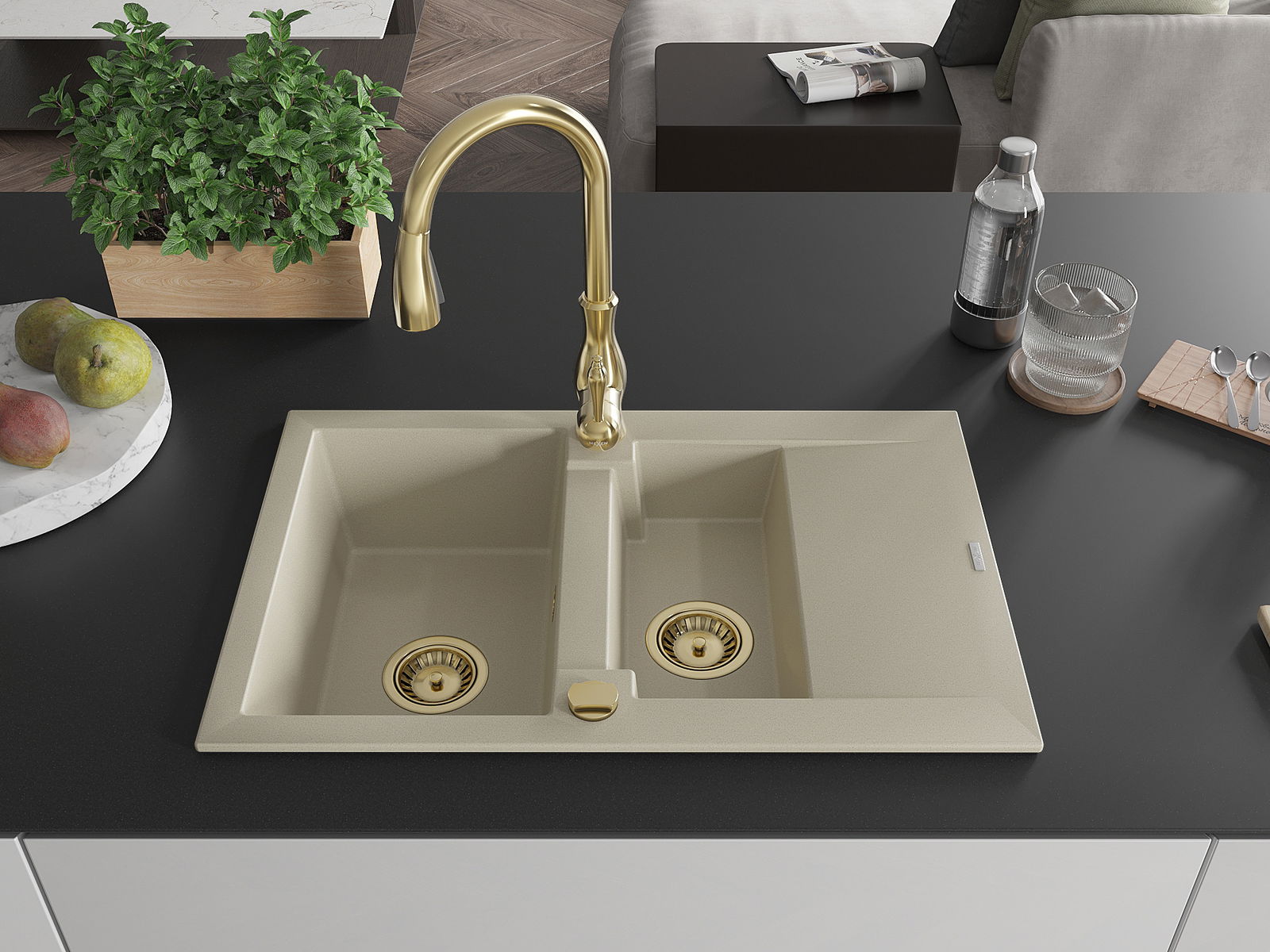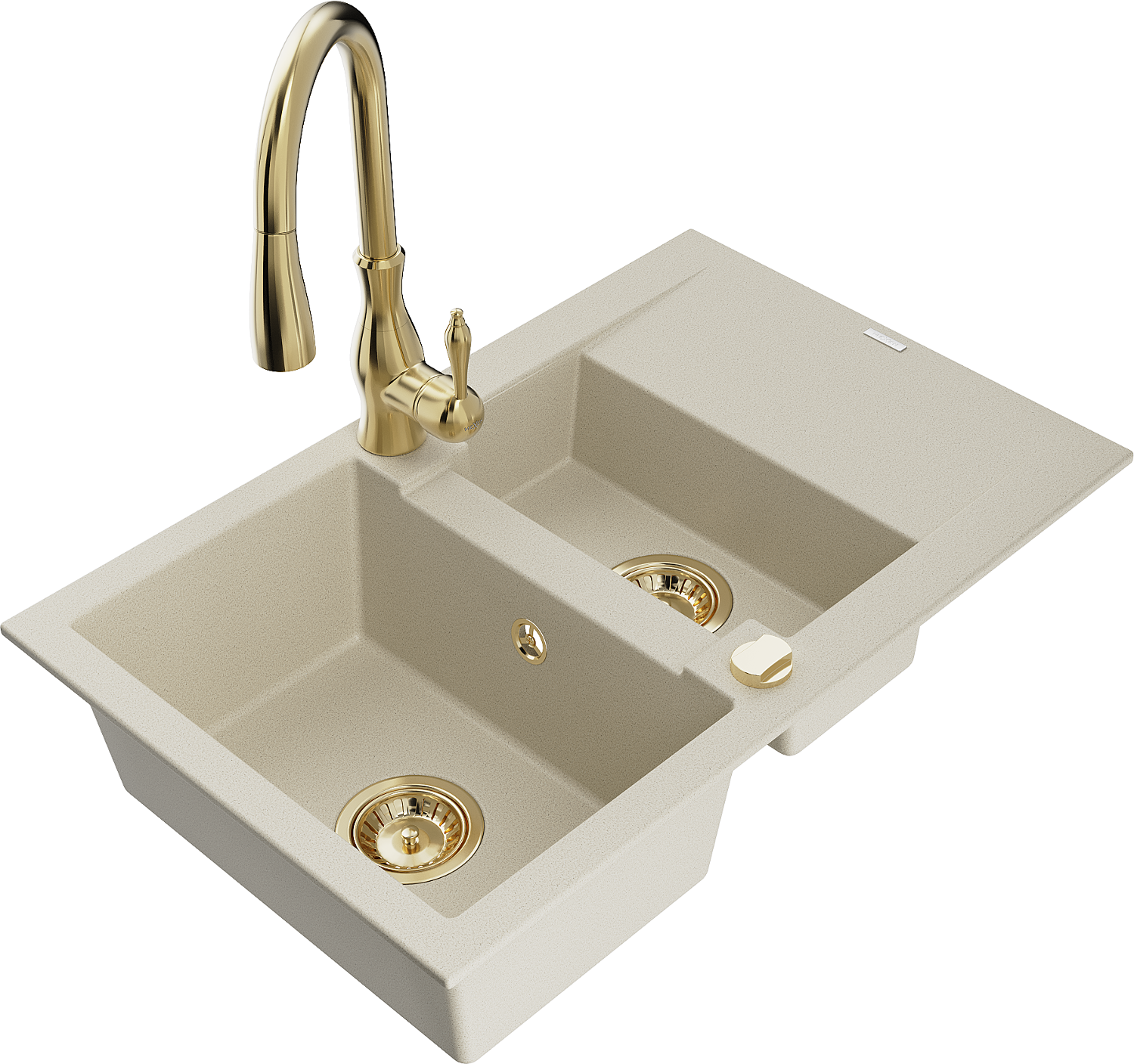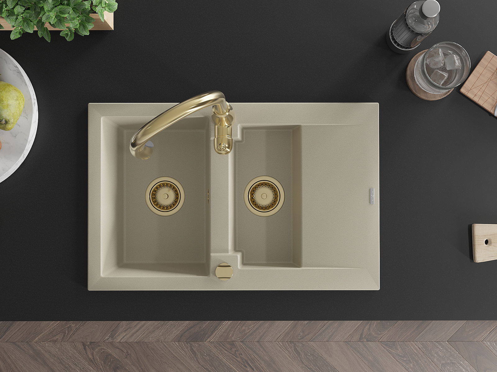 Mexen Gaspar granitový dřez 1,5-komorový s odkapávačem a kuchyňskou baterií Savita, béžový - 6507-69-672601-50
