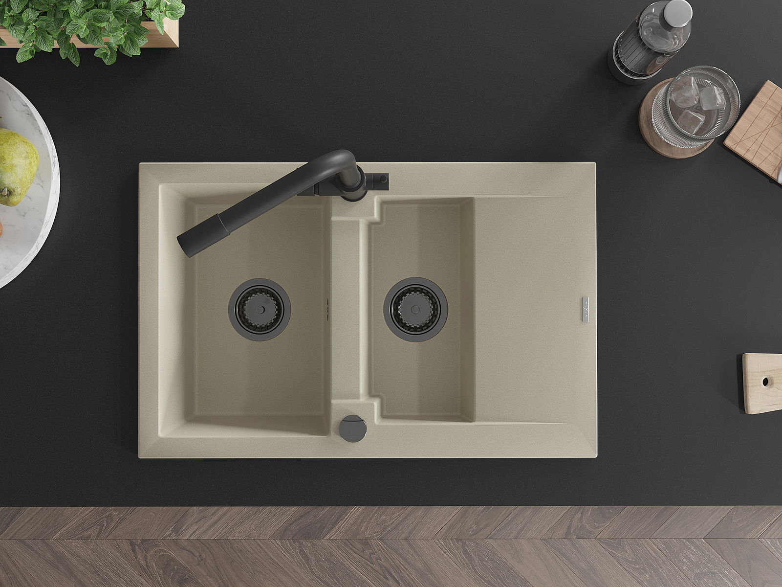 Mexen Gaspar dřez žulový 1,5-komorový s odkapávačem a kuchyňskou baterií Duero, béžový - 6507-69-671600-70