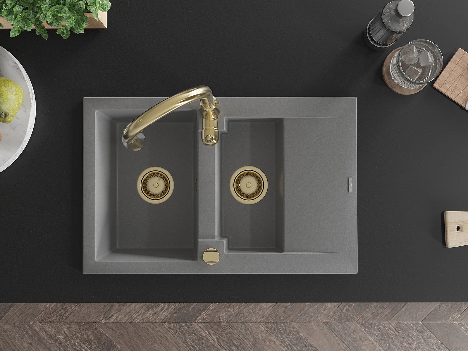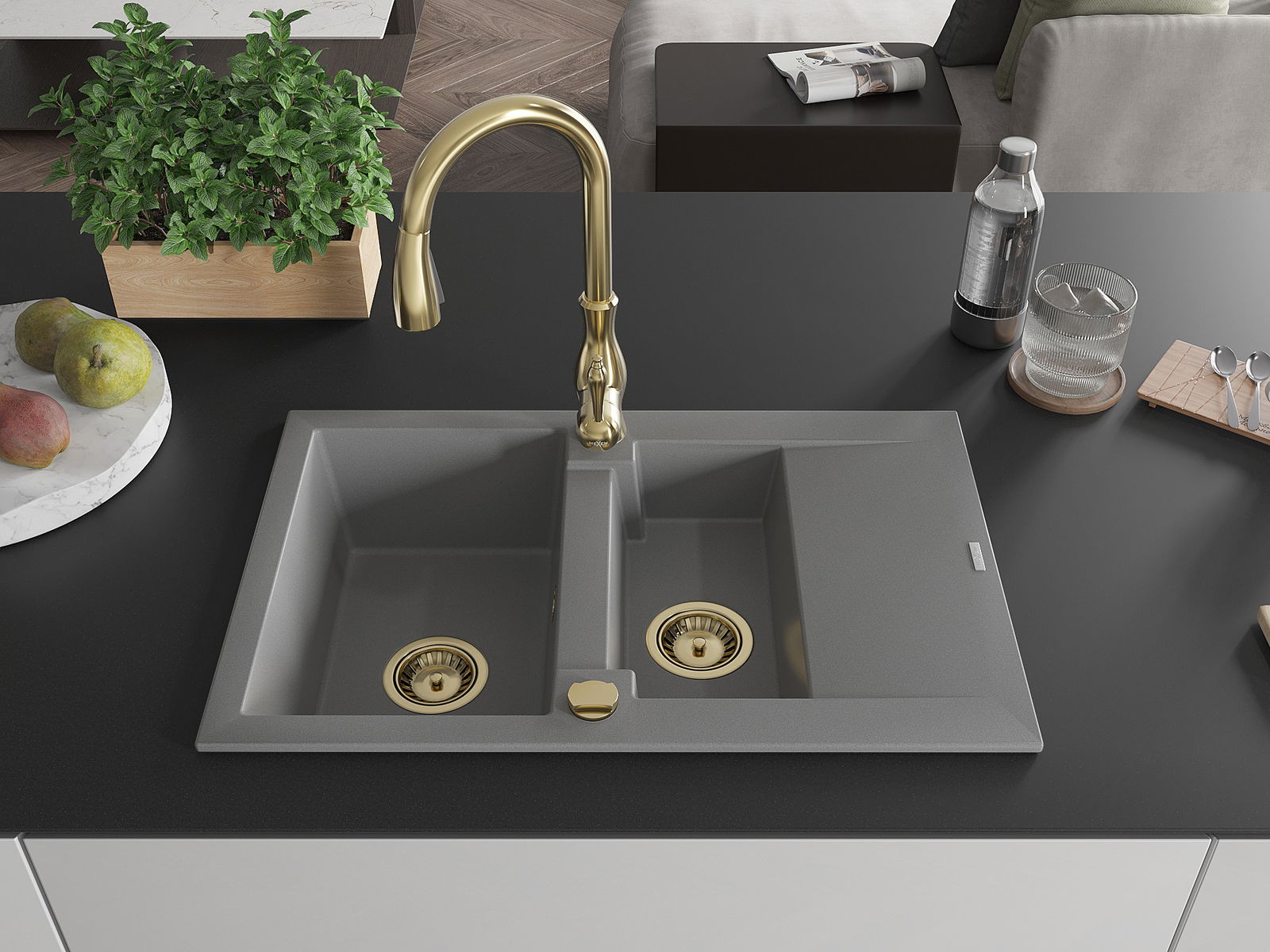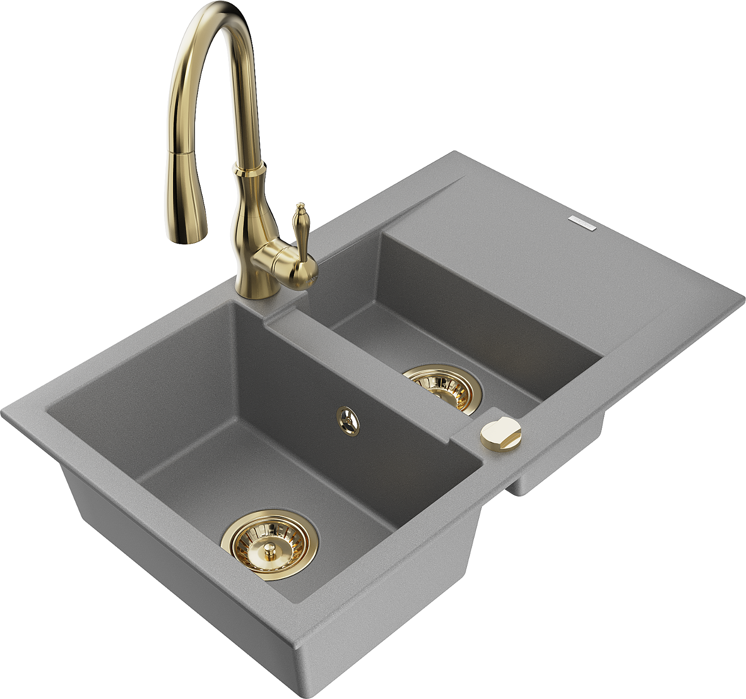 Mexen Gaspar granitový dřez 1,5-komorový s odkapávačem a kuchyňskou baterií Savita, šedý - 6507-71-672601-50
