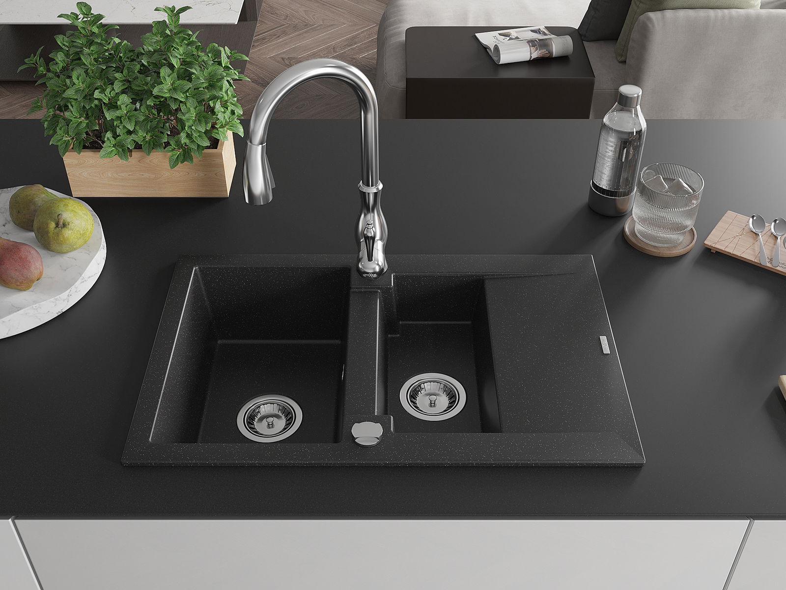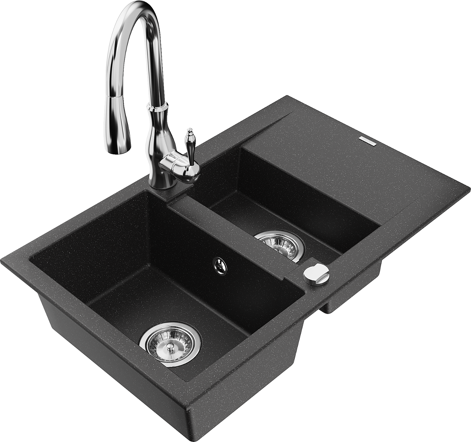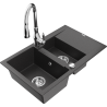 Mexen Gaspar žulový dvojkomorový dřez s odkapávačem a kuchyňskou baterií Savita, černý/stříbrný - 6507-73-672601-00