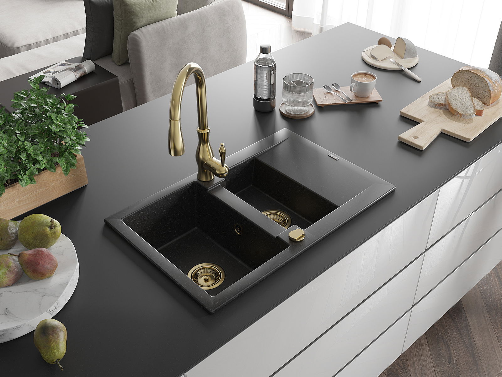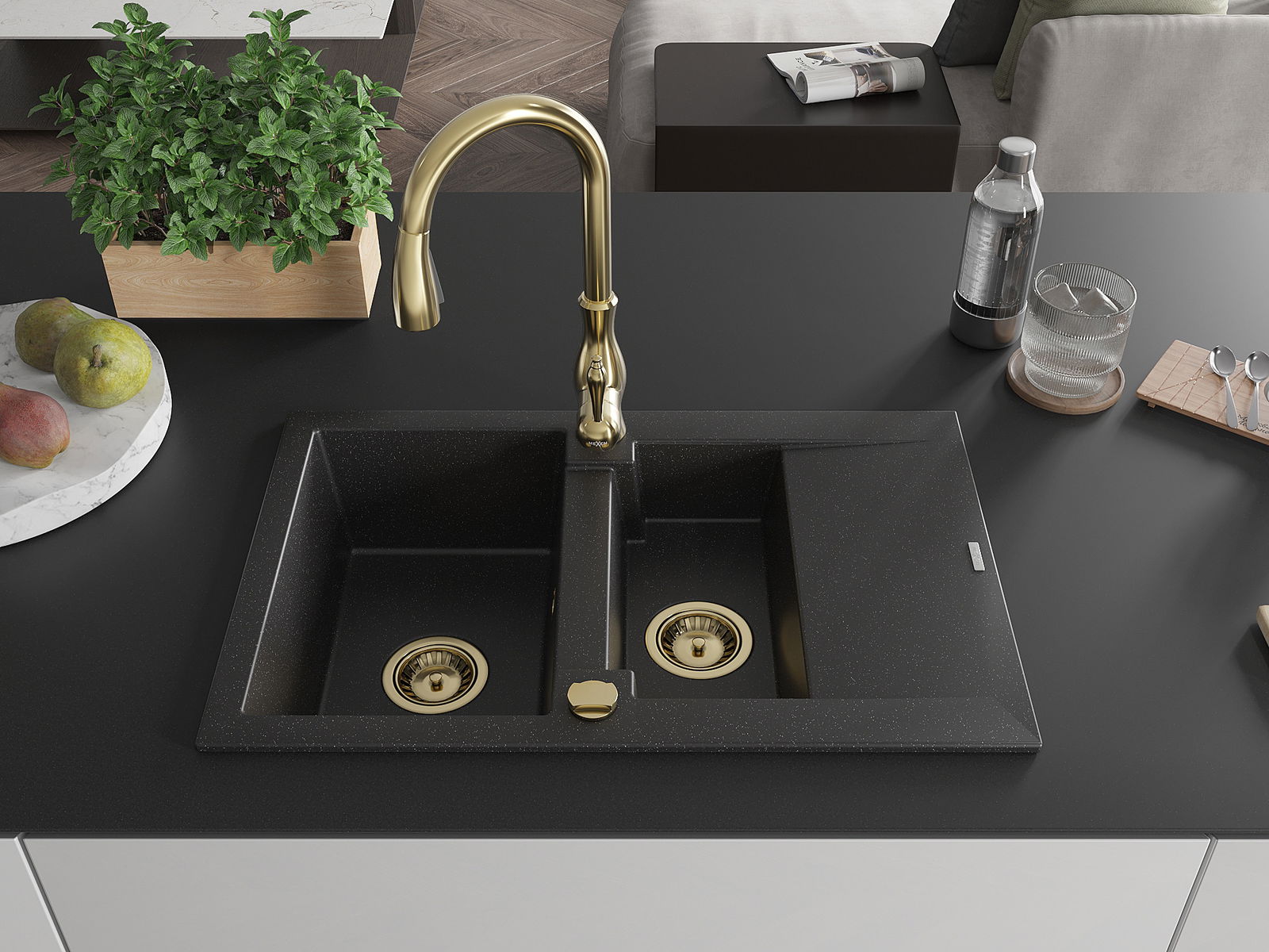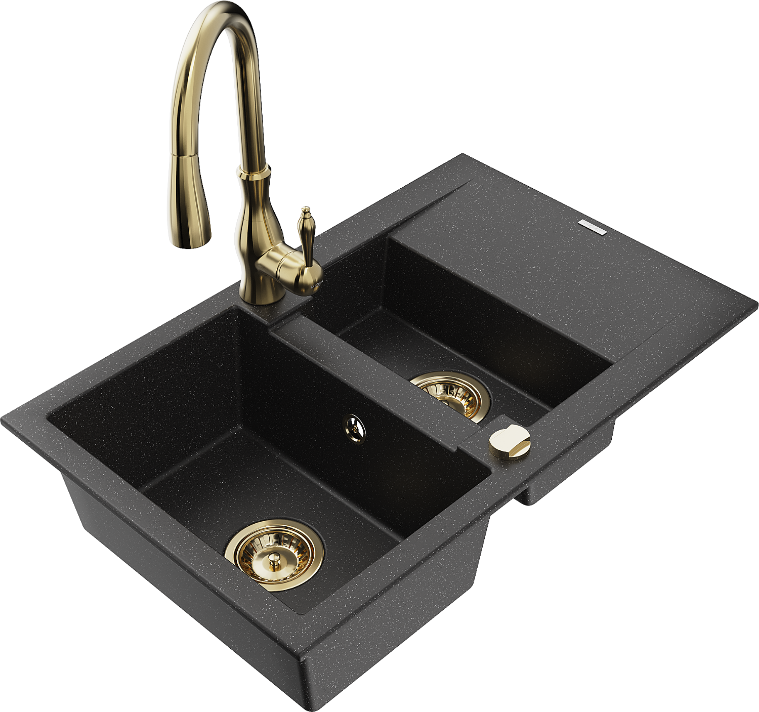 Mexen Gaspar žulový dřez 1,5-komorový s odkapávačem a kuchyňskou baterií Savita, černý/stříbrný - 6507-73-672601-50