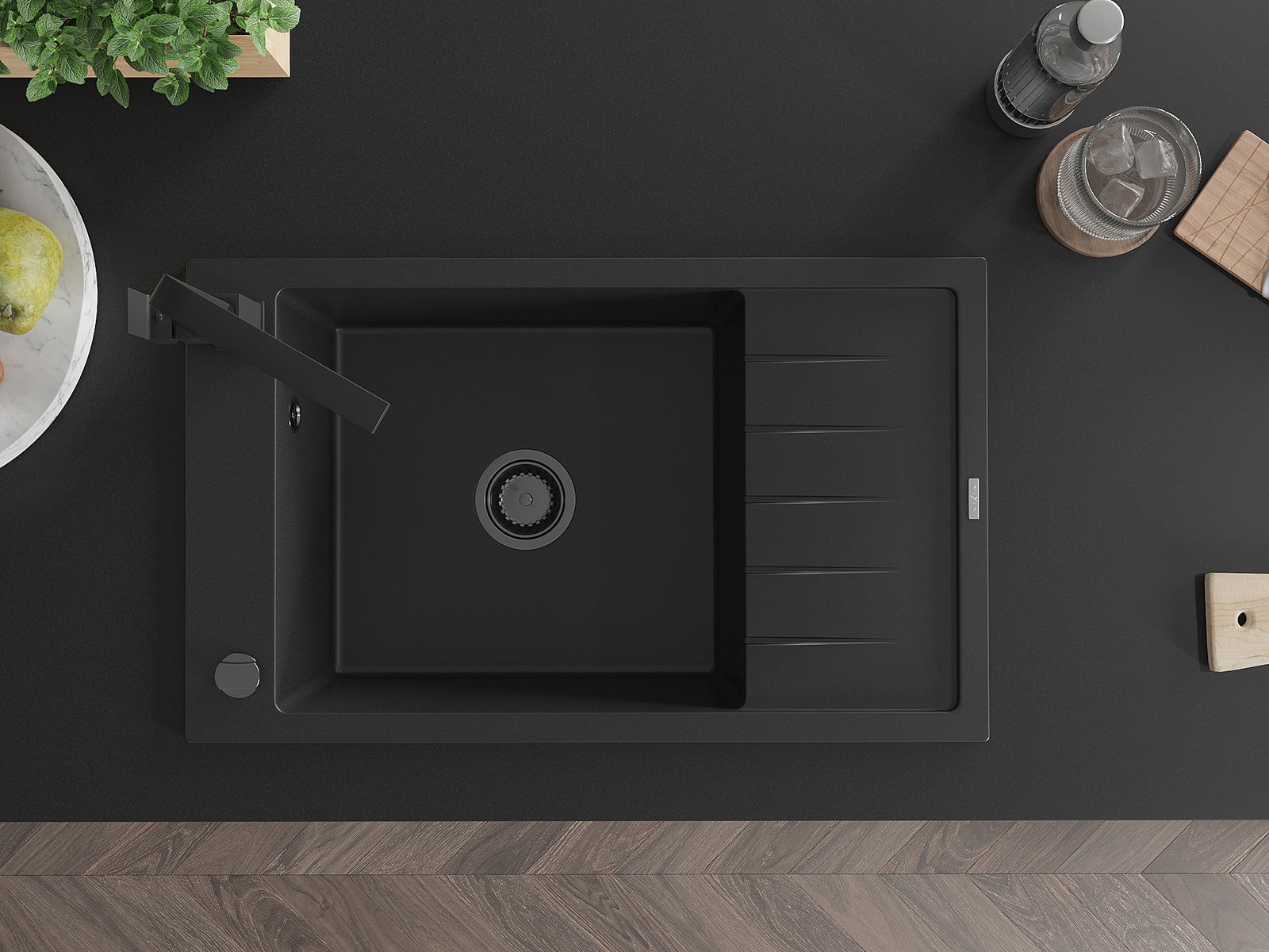 Mexen Elias granitový dřez s jednou komorou, odkapávačem a kuchyňskou baterií Rita, černý - 6511-77-670300-70-B