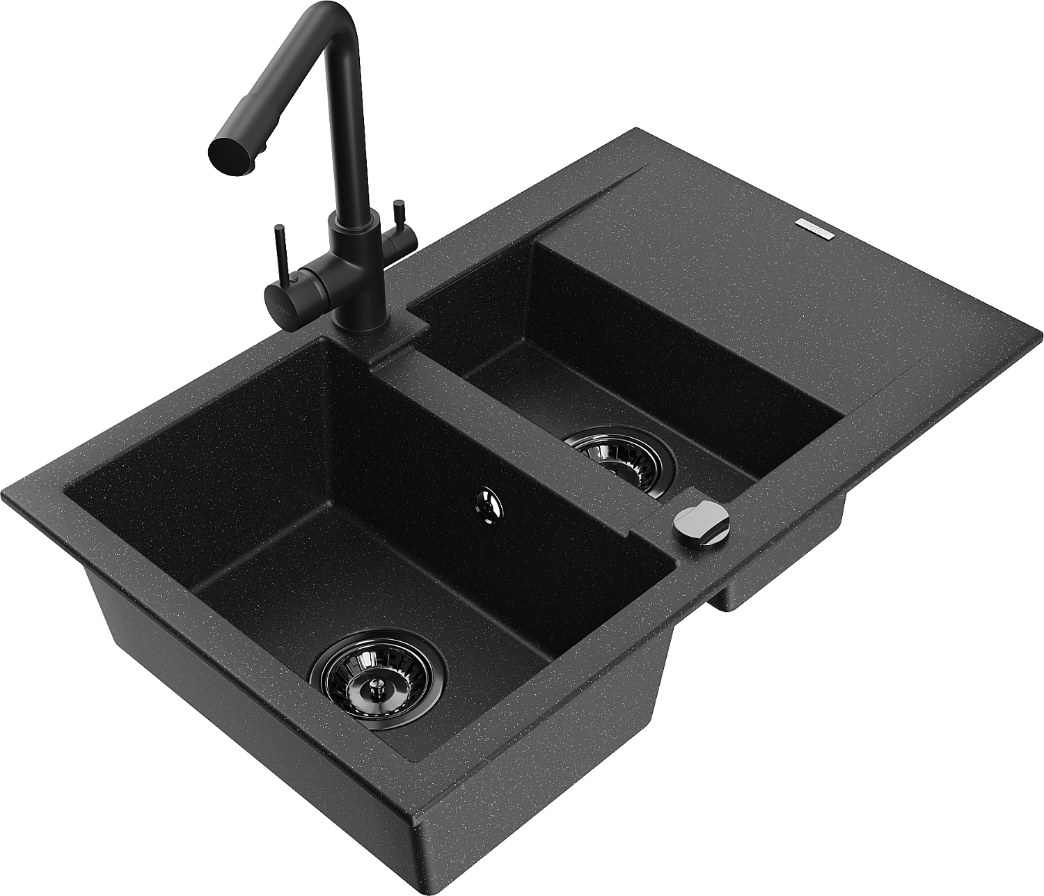 Mexen Gaspar granitový dřez 1,5-komorový s odkapávačem a kuchyňskou baterií Duero, černý/stříbrný - 6507-73-671600-70-B