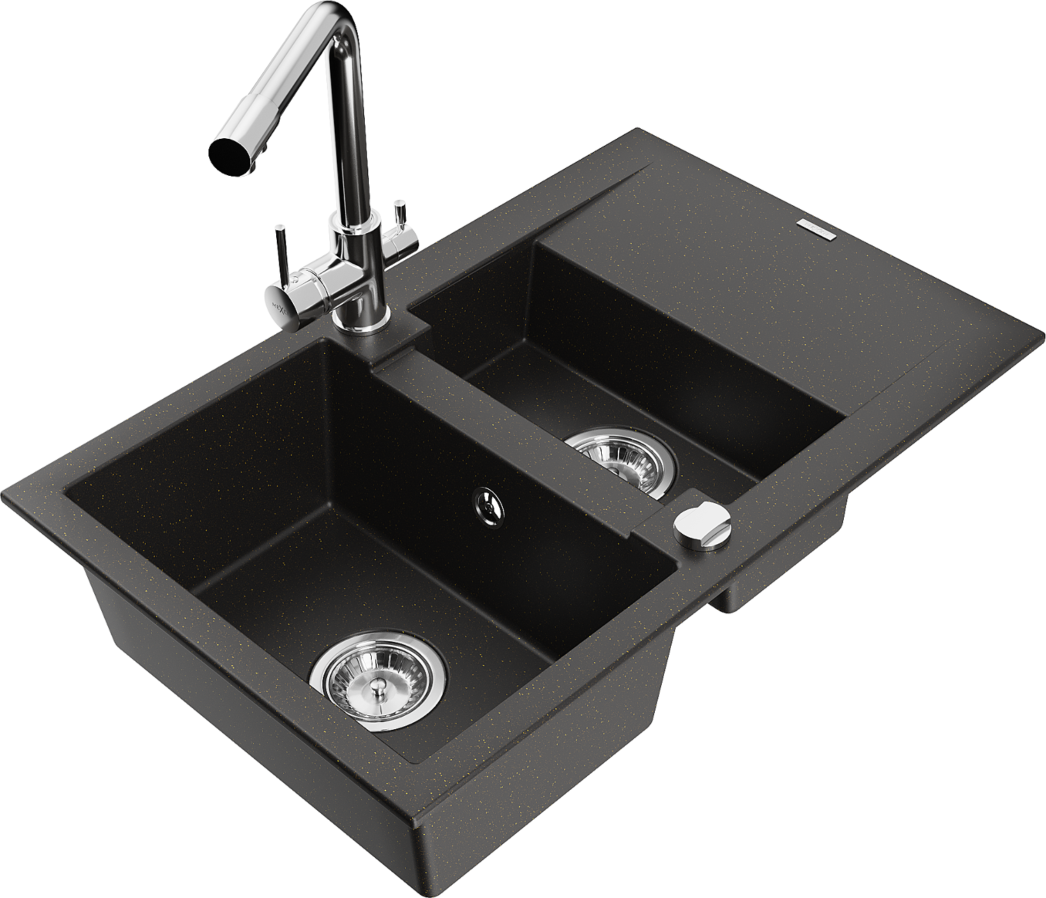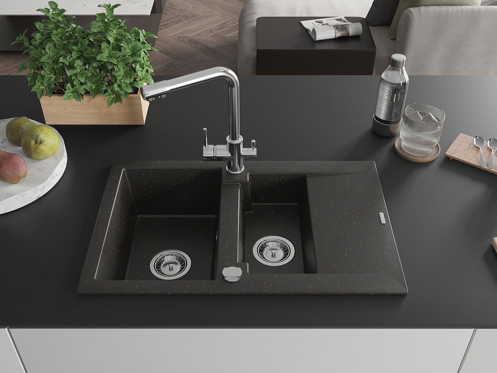 Mexen Gaspar granitový dřez 1,5-komorový s odkapávačem a kuchyňskou baterií Duero, černý/zlatý metalik - 6507-75-671600-00