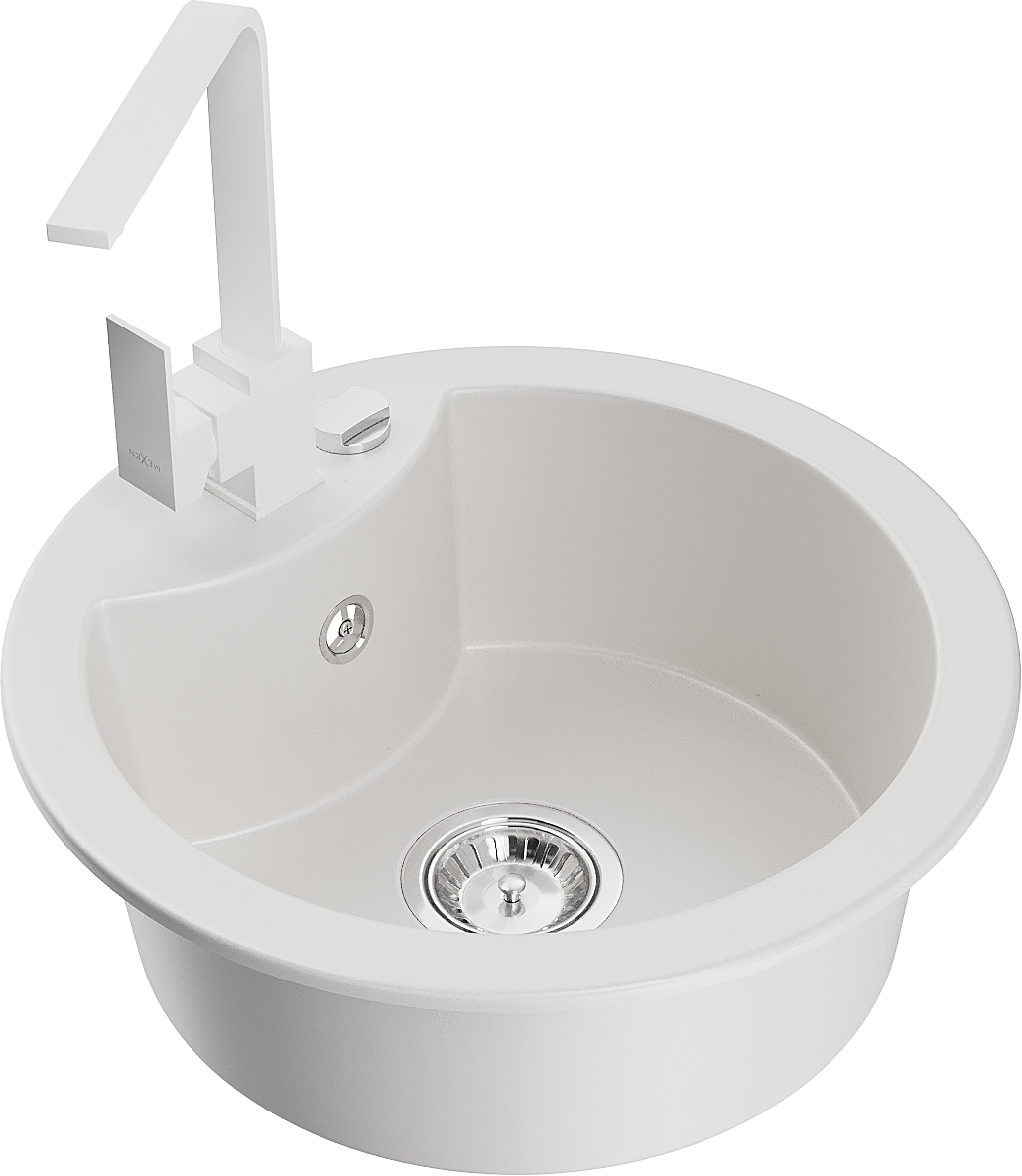 Mexen Diego granitový dřez 1-komorový s kuchyňskou baterií Rita, bílý - 6512-20-670300-20