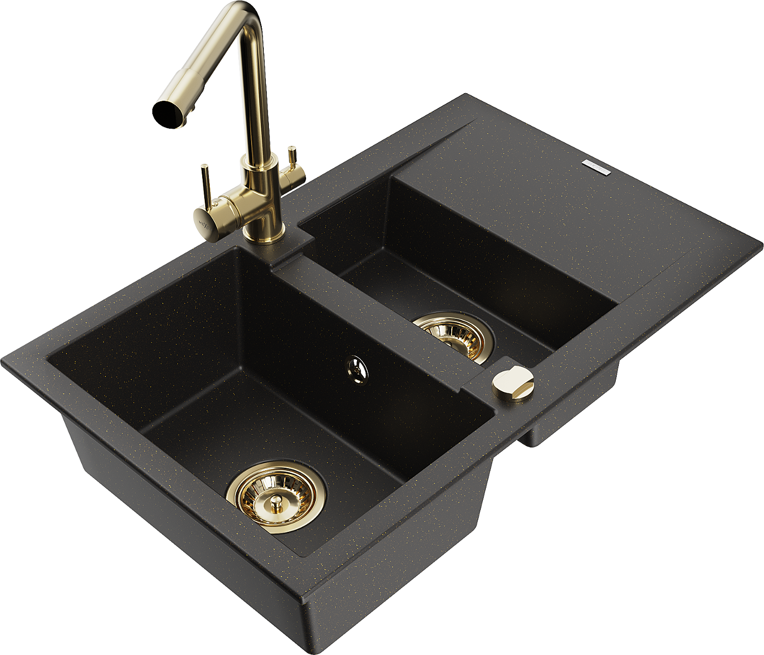 Mexen Gaspar granitový dřez 1,5-komorový s odkapávačem a kuchyňskou baterií Duero, černý/zlatý metalik - 6507-75-671600-50