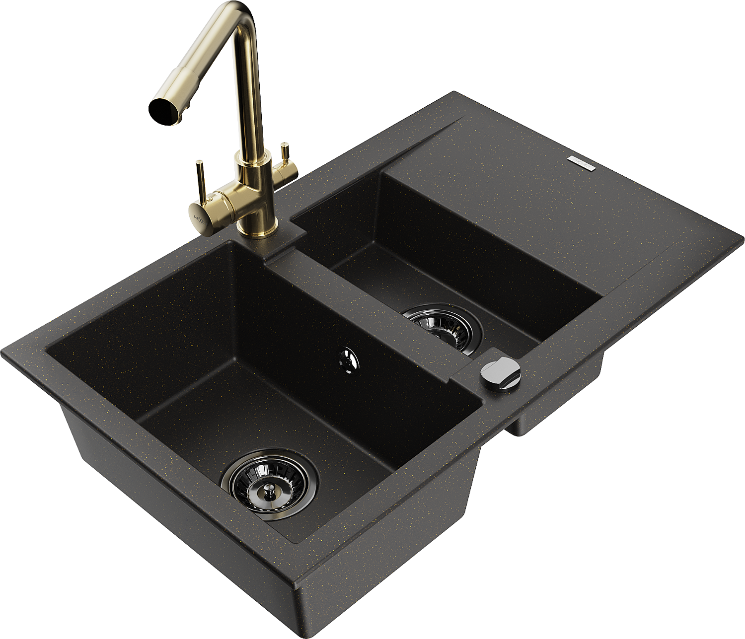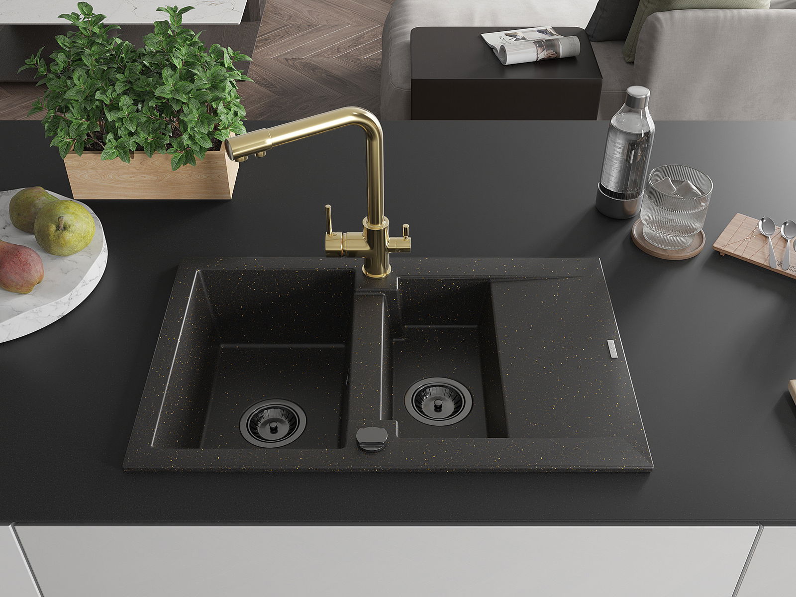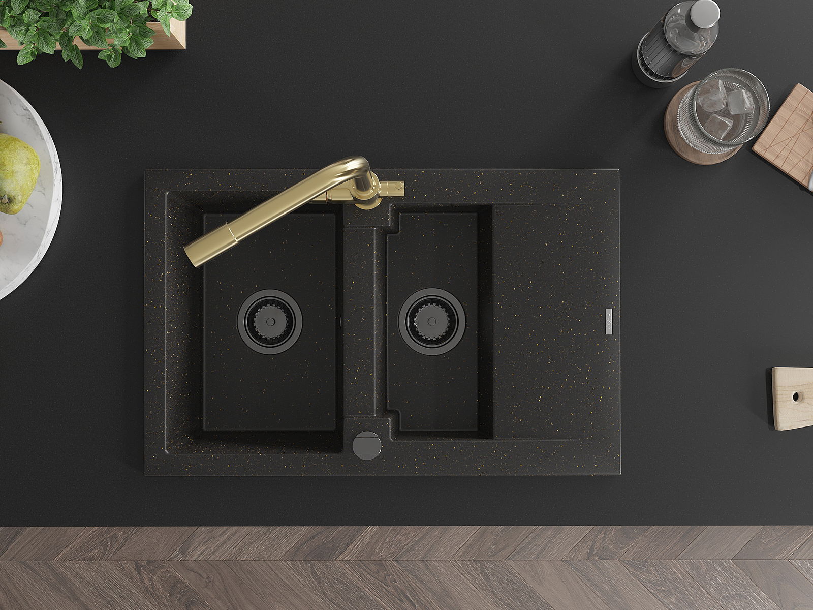 Mexen Gaspar granitový dřez 1,5-komorový s odkapávačem a kuchyňskou baterií Duero, černý/zlatý - 6507-75-671600-50-B
