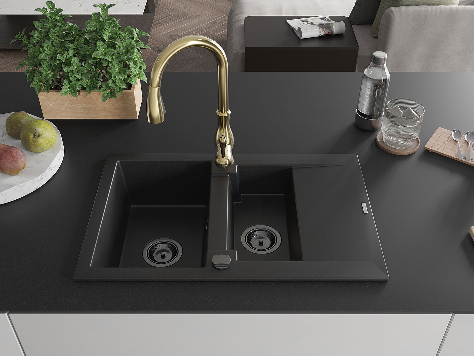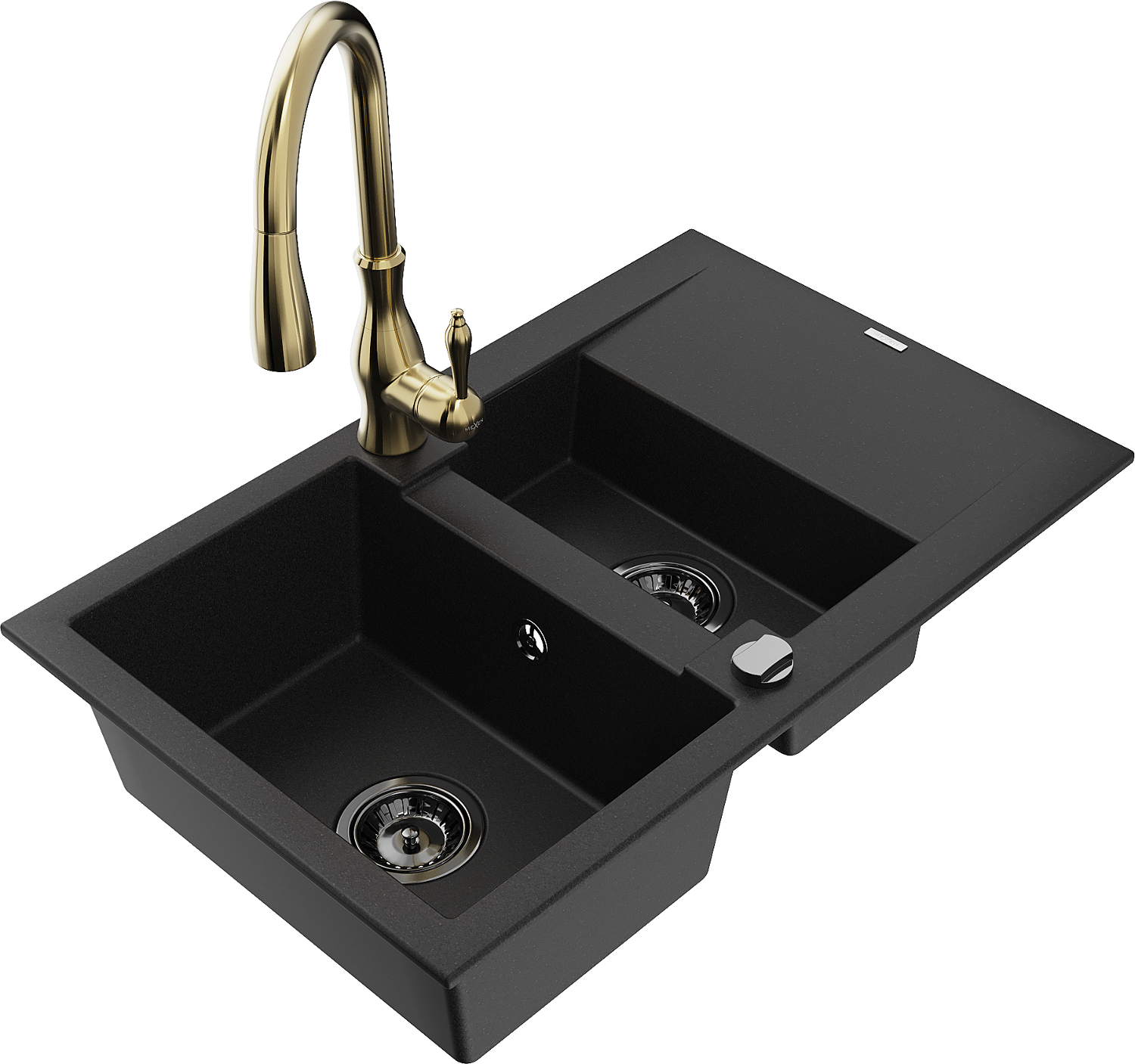 Mexen Gaspar granitový dřez 1,5-komorový s odkapávačem a kuchyňskou baterií Savita, černý - 6507-77-672601-50-B