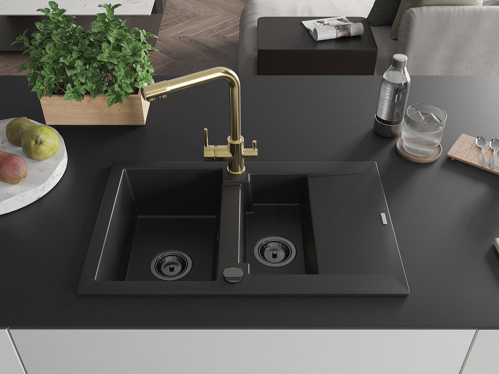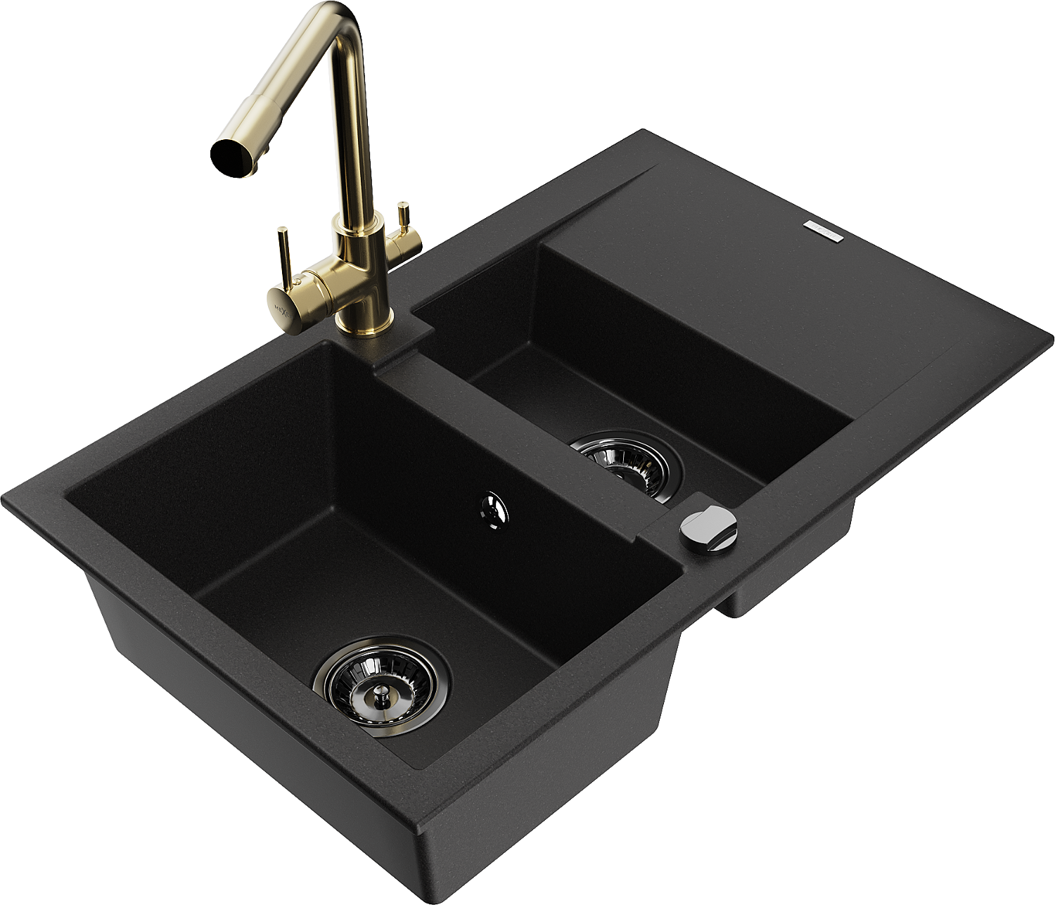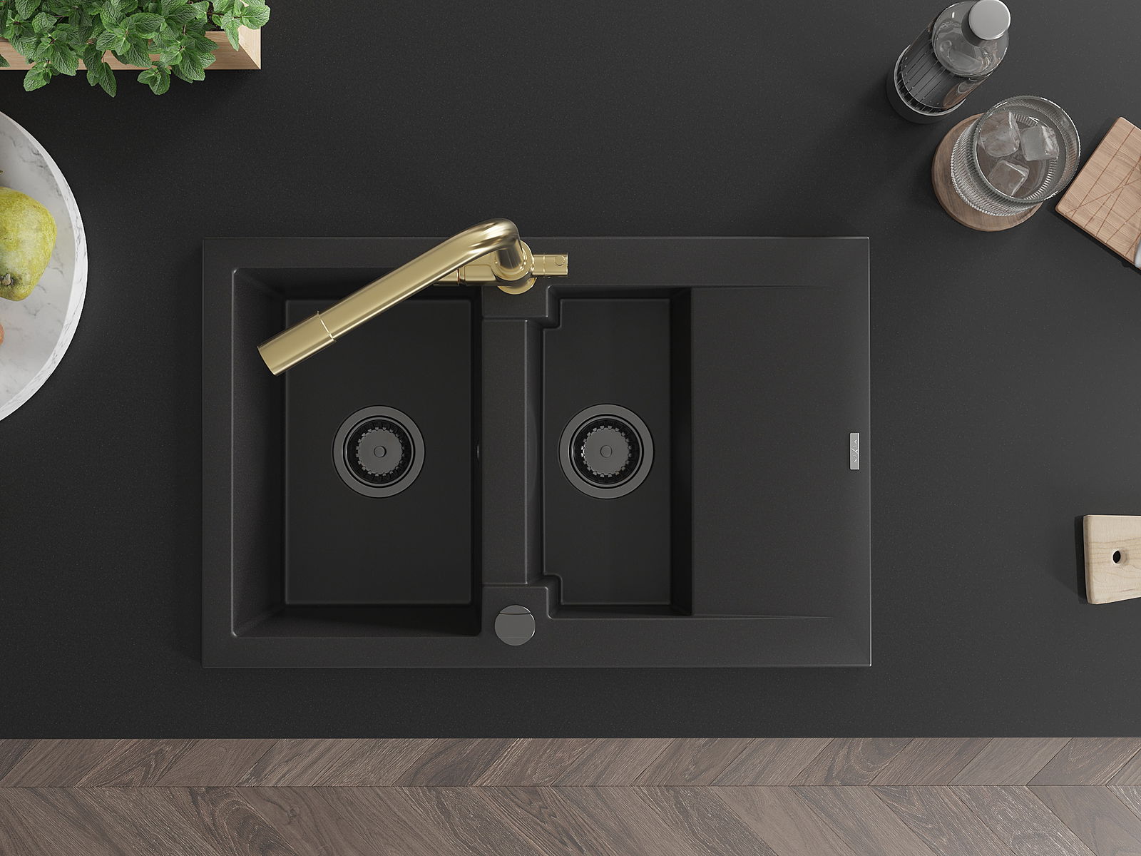 Mexen Gaspar granitový dřez 1,5-komorový s odkapávačem a kuchyňskou baterií Duero, černý - 6507-77-671600-50-B
