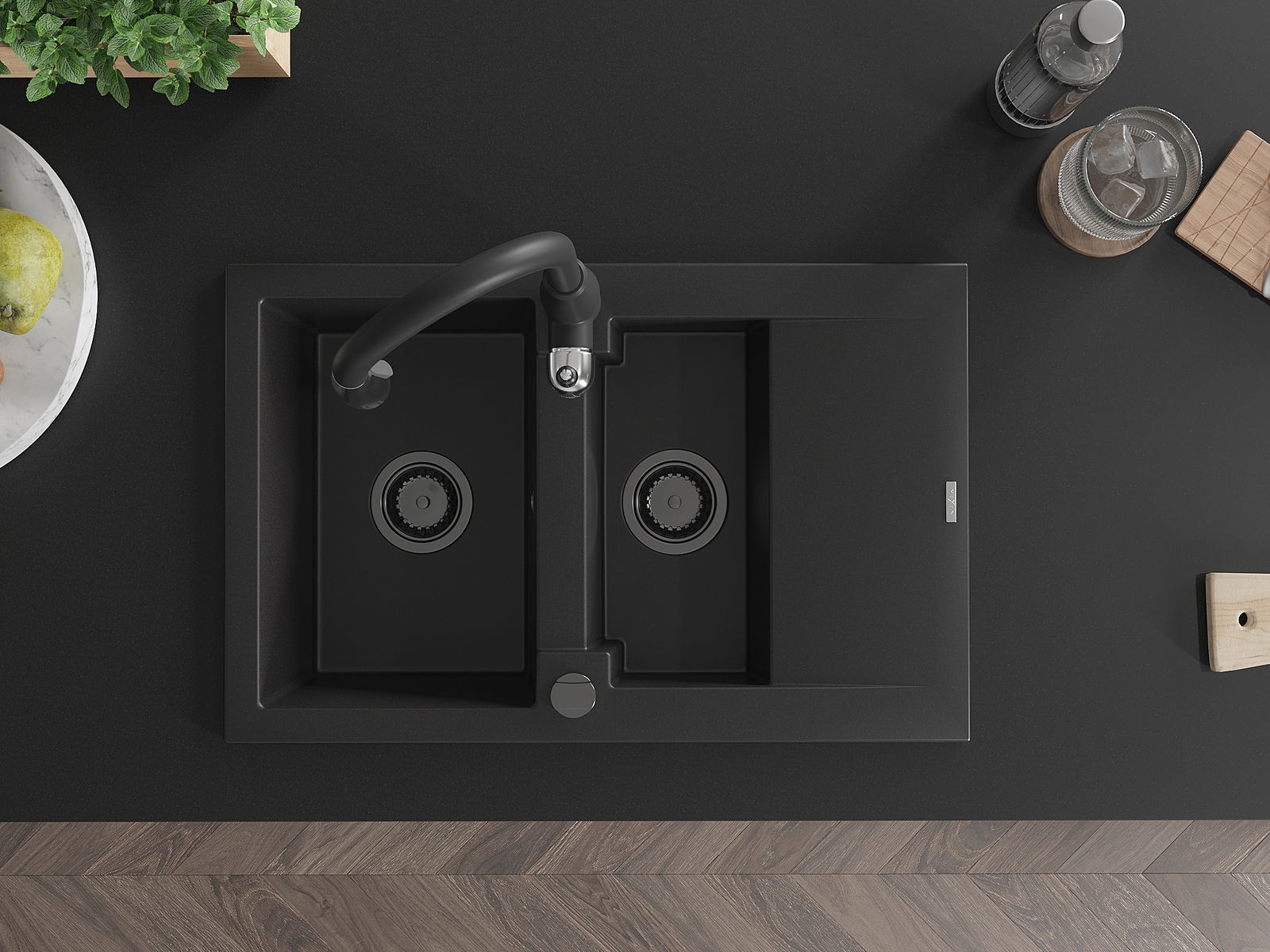 Mexen Gaspar granitový dřez 1,5-komorový s odkapávačem a kuchyňskou baterií Savita, černý - 6507-77-672601-70-B